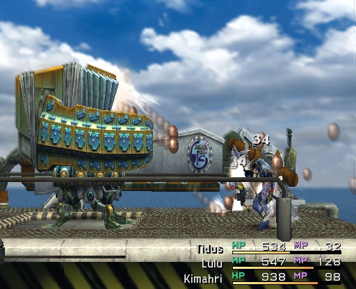 Tidus will notice a crane on the deck, which needs to be hit with Thunder three times before he can use a Trigger Command to activate it and remove Oblitzerator's top half, lowering its HP to 1/16th (a maximum of 375) and preventing it from using Blitzball Rush or its counterattacks. The battle can be difficult if the crane isn't used, as Yuna is not available to heal the party or call an aeon, and the Oblitzerator's Agility increases to 16 when below 2,000 HP and again to 26 when below 500.