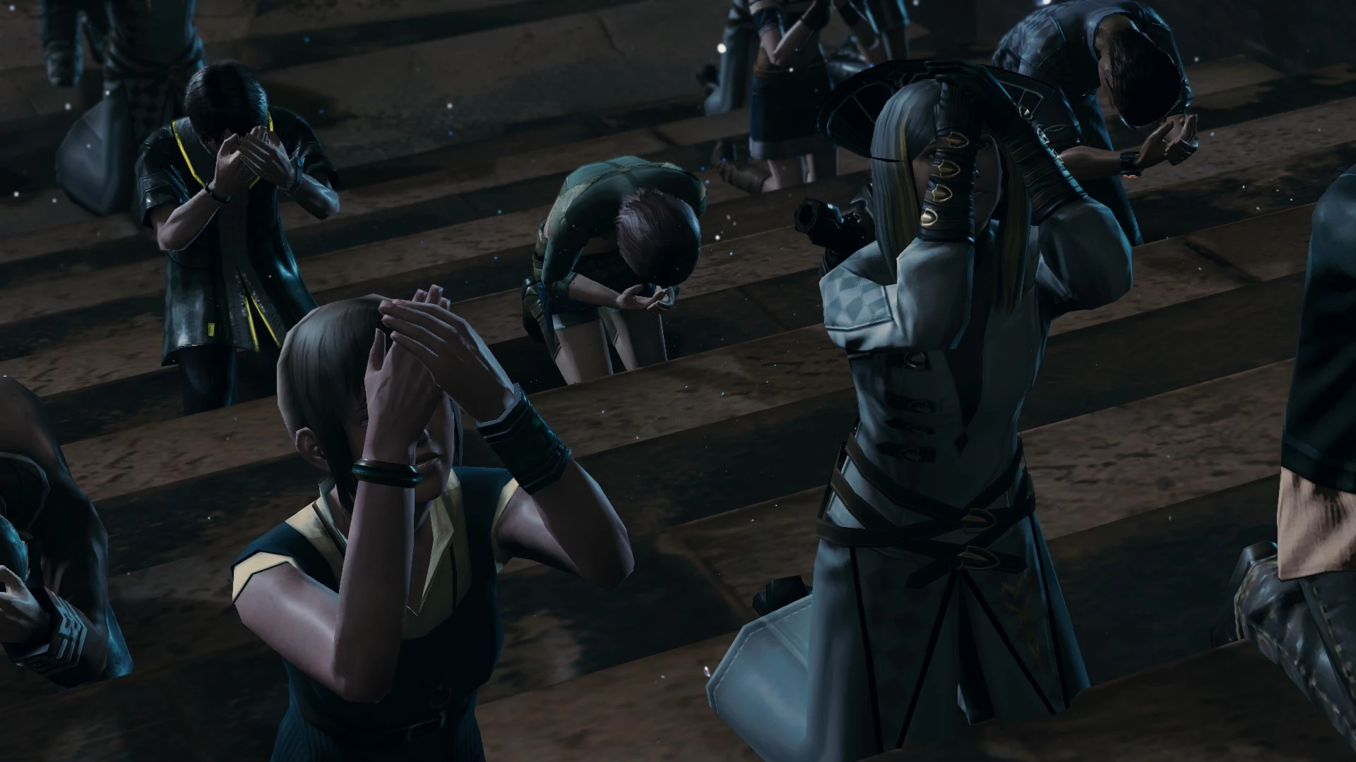 Members and followers pray by crossing their left hand over their right, so their fingers rest on each other, and their hands form the shape of an 'X'. A person can hold their thumbs against the edge of their hand or extend them out as seen with Vanille. One can also either have their crossed hands close to their chest or raise them up and down in a bowing fashion.
