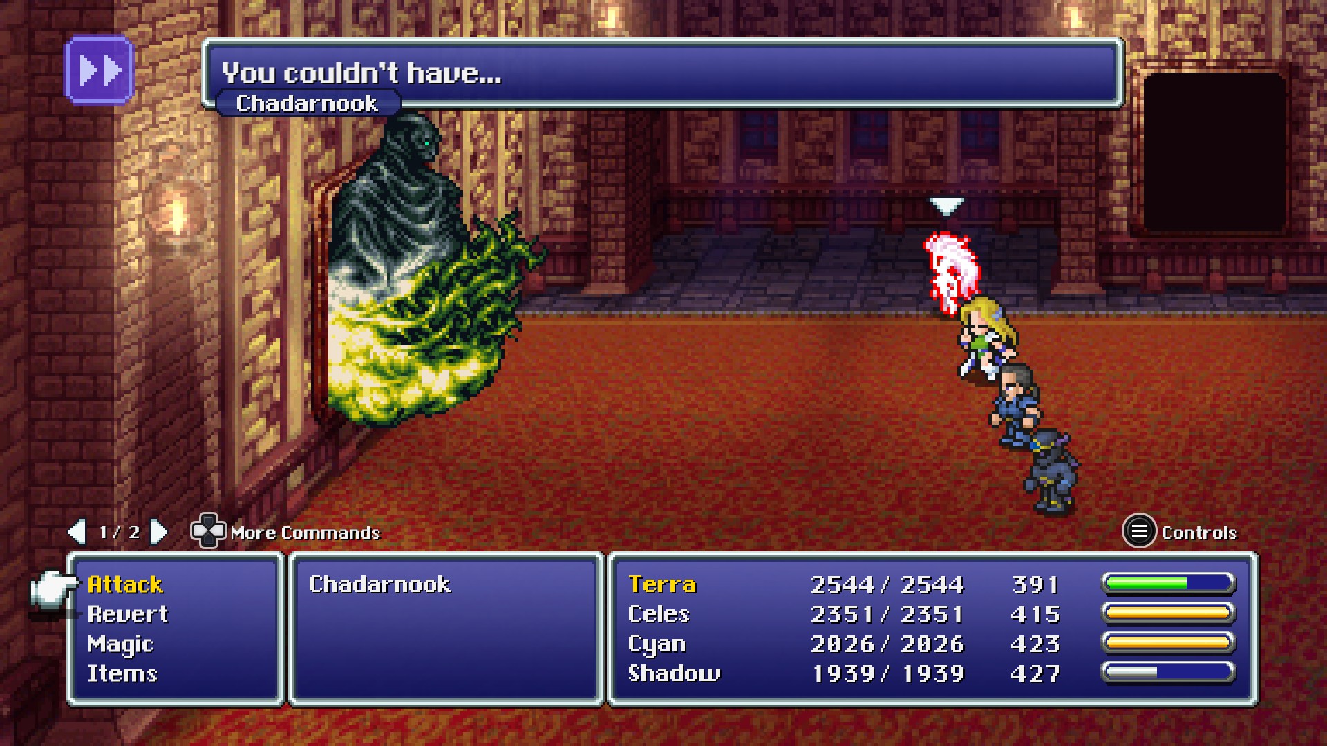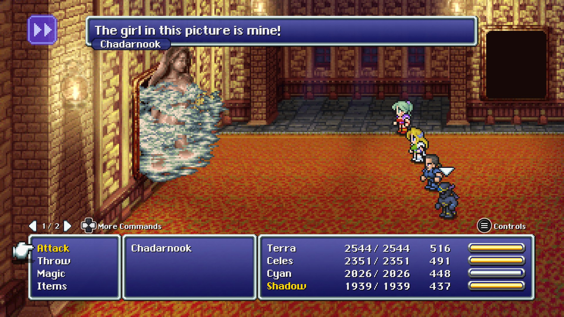 In the Pixel Remaster port, the windows of the mansion are illuminated from within. In the World of Ruin under the influence of Chadarnook, the windows glow an eerie purple and a shadowed silhouette drifts across the windows.