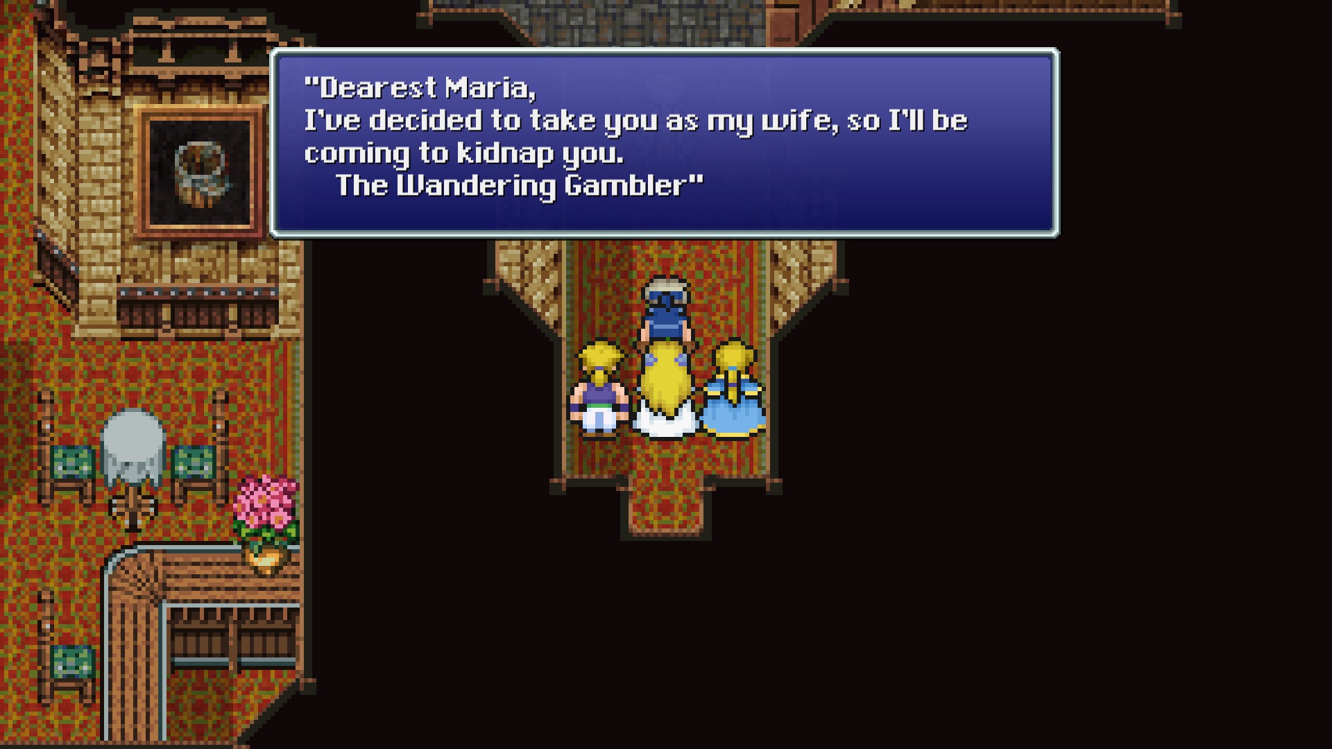 In the World of Ruin, if the player inspects Emperor Gestahl's portrait twice, they receive the key item Emperor's Letter, which hints to the location of the Phoenix Cave.