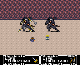 Artwork for the European version shows Phoebe with a shield as she wields her Cat Claw. This is interesting as, even if this shield isn't the Ether Shield, Phoebe doesn't use a shield until she rejoins Benjamin, equipped with the Ether Shield, at the end of the game, long after she's given the Cat Claw to Benjamin and switched to the Bow of Grace.