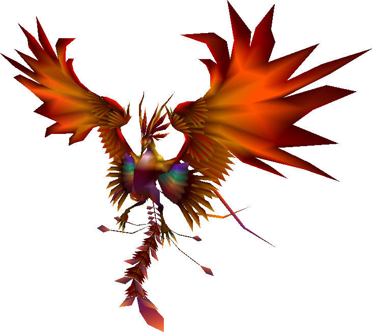 Its Rebirth Flame deals Fire damage to all opponents, and revives fallen party members. Restored HP is doubled if Concentrate is equipped. Phoenix is randomly summoned automatically if Eiko is in the party and the party is annihilated. This rate is proportional to the amount of Phoenix Pinions the party has in the inventory. When Phoenix is summoned automatically to save the player from a Game Over, it has a different summon animation, deals no damage to enemies, and uses no MP.