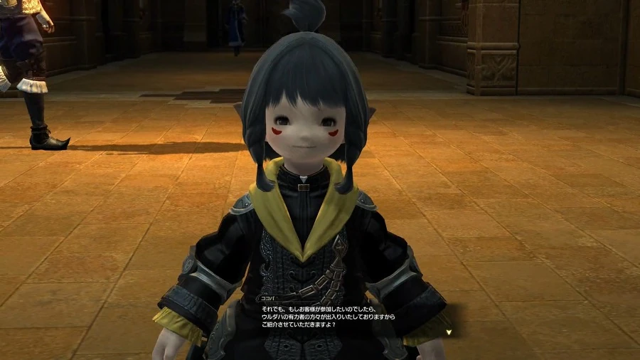 Qoqoba is present at the Platinum Mirage when Niellefresne is defeated by Thancred in a match, and witnesses Thancred unmasking the festival incident by claiming that everything was orchestrated by Niellefresne in an attempt to make him and his companions look like heroes to the townspeople.[1]