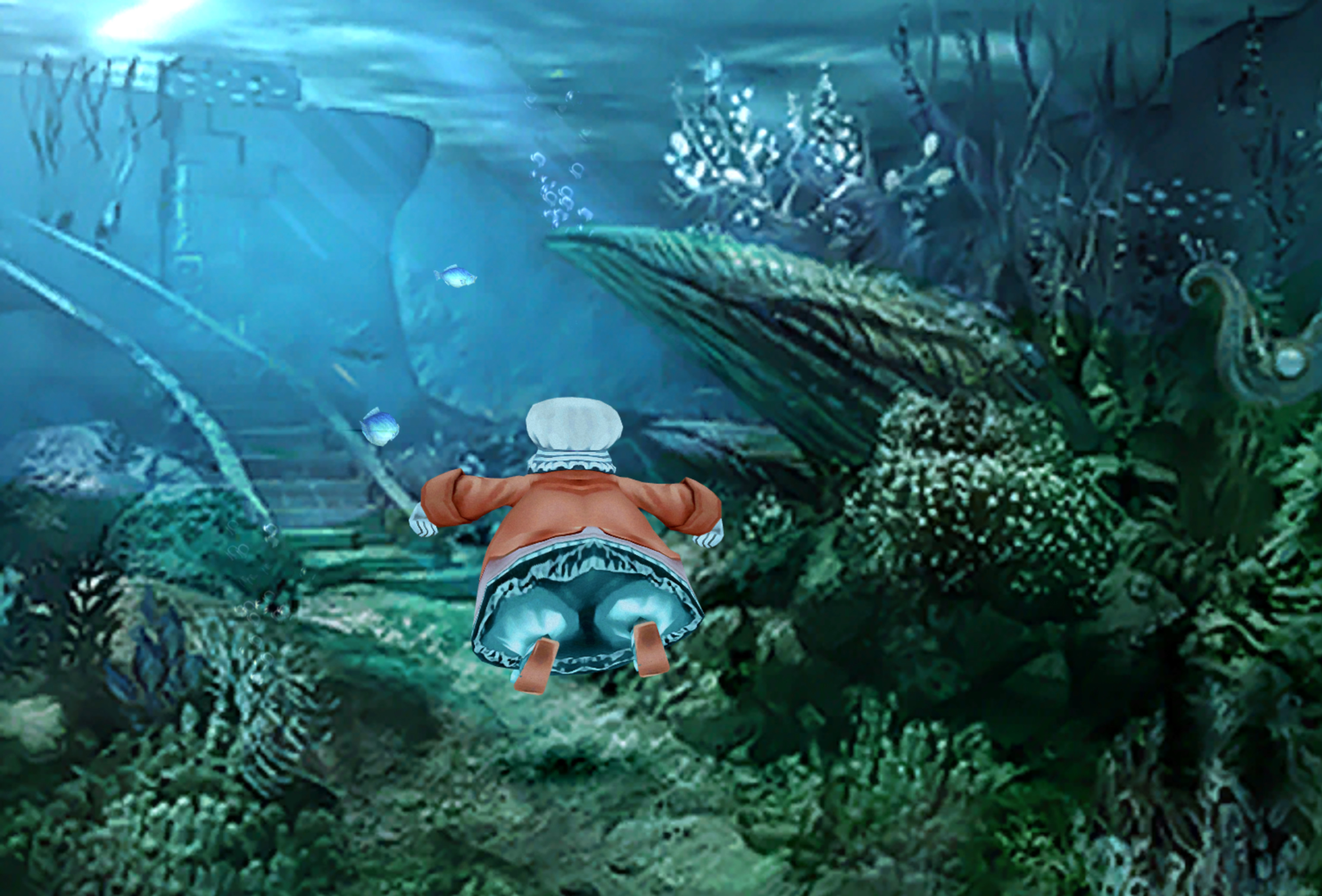 Quina is paired with Zidane when the party decides to tackle the elemental shrines simultaneously, and is unbothered by Zidane's admission that he only took Quina because they were the one left over when everyone else had already left, stating that leftovers are a good thing. When the heroes reach Terra, Quina candidly interacts with the unresponsive Genomes at Bran Bal. They attempt to taste a large luminous stone seemingly worshiped by the Genomes, to no avail. When the airship Invincible is used to escape Terra, Quina warps in at the last minute from underneath the ship. The rest of the party also uses the warp when they descend into Memoria. While in Memoria, Quina is the only party member not to see a memory of the destruction of Alexandria, largely because they were not with the others when it was destroyed. Quina later experiences Gaia's early era as a globe covered in ocean and tries to swim through it.