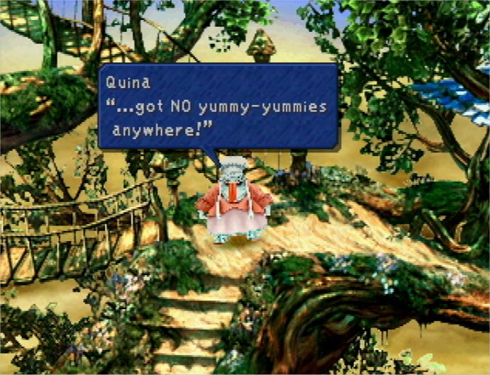 Quina joins the party for their trek through Gizamaluke's Grotto, Burmecia, and Cleyra while being obsessed with hunting for new kinds of food, which they refer to as "yummy-yummies". At the party's stay in Cleyra, Quina is upset that the locale has no exotic food to be had, settling on a pair of pink mushrooms whose edibility is questionable.