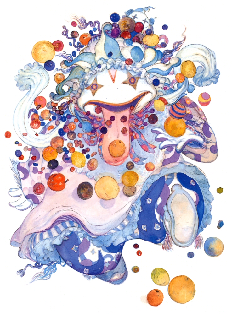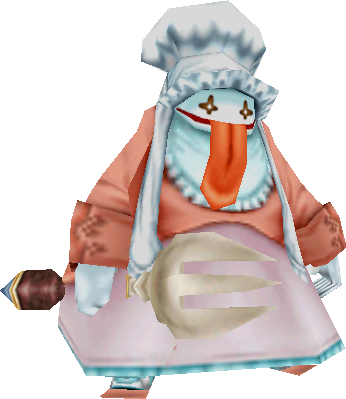 Quina is a genderless Qu, a tribe known for their strange eating habits, long tongues, and poor language skills. Quina wears a chef's hat, and their tongue hangs out to the middle of their chest. They wear a salmon-pink overcoat with a baby-pink apron over it, has a napkin tied around their neck, and wears white gloves and blue shoes with white ribbons. In Trance, Quina's facial area resembles Vivi's (long black tongue notwithstanding) having disappeared into a void with only bright white eyes to hint they have a face. Clothes are replaced by an obese armor set complete with an elaborate neck armor and their chef's hat may possibly be metal as well. The armor includes a decorative design on the chest.