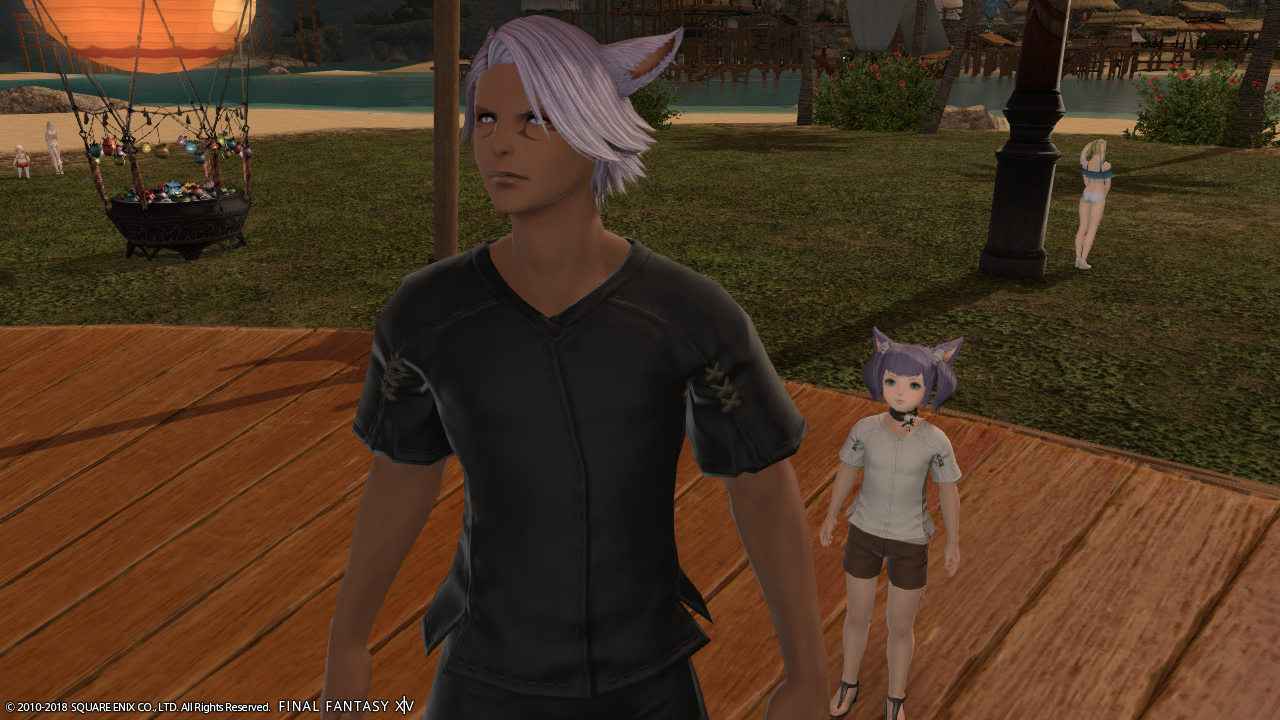 After Warrior of Light has completed the challenge, R'fhul Tia eagerly prepares for his own attempt. R'majha rushes ahead to find a spot from where the two of you can watch her brother's acrobatics. Immediately after placing his foot on the starting platform, R'fhul Tia steps forward to make the first jump. Unfortunately, he immediately falls into the water below. After dragging himself to the beach, R'fhul Tia regains his composure and tries to hide his embarrassment with laughter. His sister is offended by this and leaves in a rage without explaining the reason for her anger.[2]