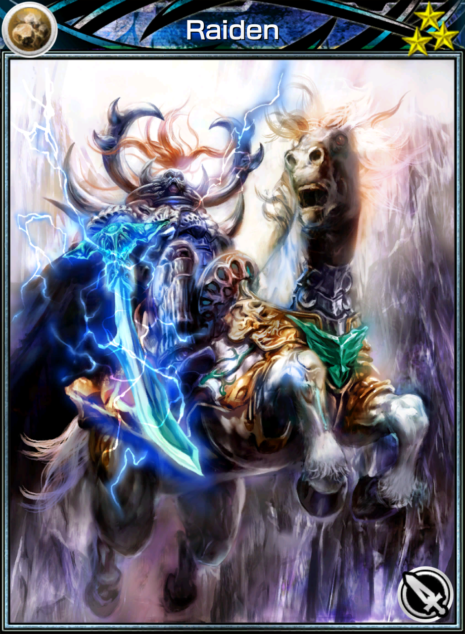 Raiden is an earth-element ability card. His ability is Earth Blast, which is a warrior ability that allows a cone earth attack. He produces four earth orbs and possesses the extra skills Bloodthirst, Elemental Retrieval and Guard Breaker. His auto-ability is HP Up+3%. He can be obtained from the Ability Card Shop or through Summoning.