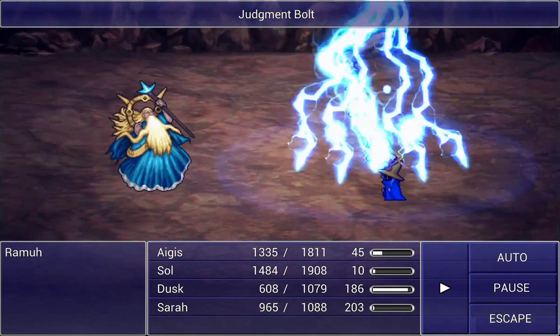 Ramuh has a lot of HP and his physical attack does about 150 damage to front row characters. He can cast damaging lightning attacks, such as Thundara, Thunderbolt, and his best move, Judgment Bolt. He can cast Sleep to counter physical attacks, and Osmose to drain MP.