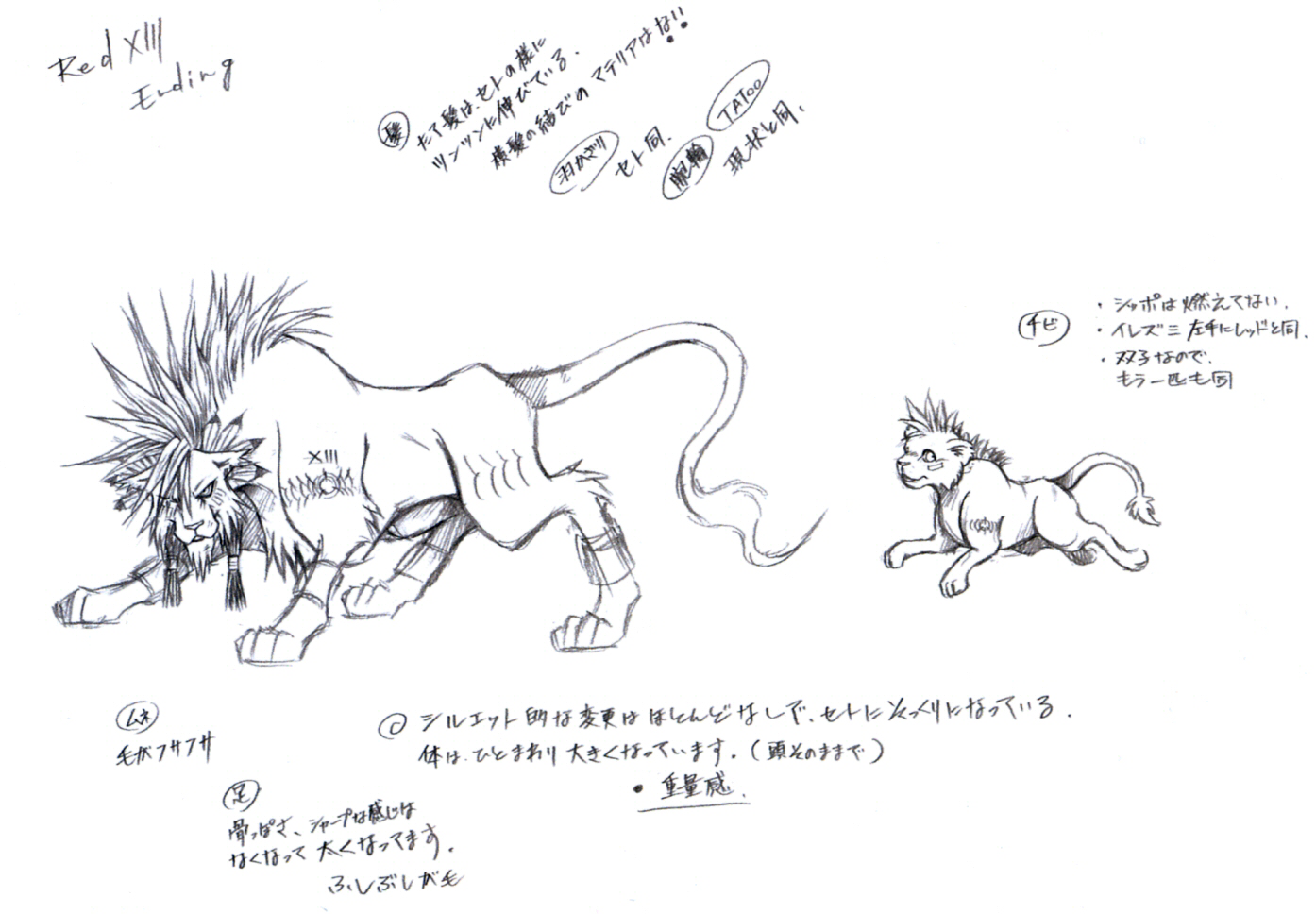 - ↑ 2.0 2.1 2.2 Final Fantasy VII 10th Anniversary Ultimania Revised Edition § "Red XIII", p. 058-059