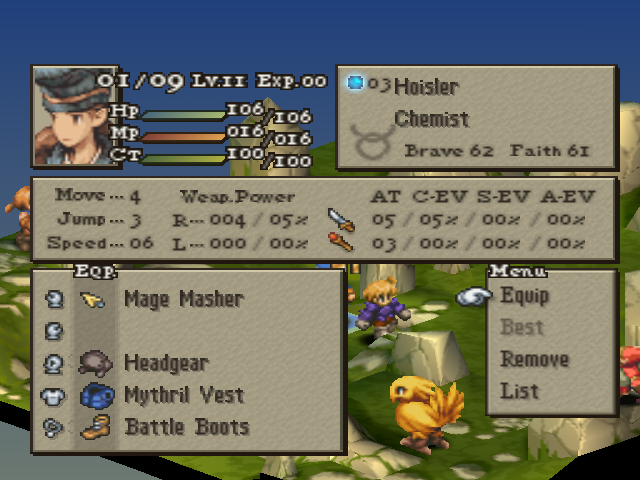 Reequip, also known as Equip Change, is a support ability in Final Fantasy Tactics, learned by the chemist job. It adds the Reequip command to the unit's ability list, which allows them to change their equipment even mid-battle, at the cost of a turn. The support ability must be learned by expending JP earned for the unit's chemist job, at which point it and other jobs can also use the ability.