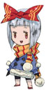 Rekoteh is a young girl with short silver hair and brown eyes. She wears a long heavy blue coat with white fur trim and black gloves. She wears black tights and pink boots. She wears a red and yellow scarf with a white pompom on each end and a large red bow with yellow designs on her head.