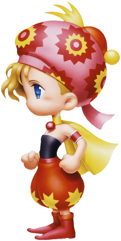 Relm is a ten-year old girl with short blonde hair and blue eyes. She wears a red turban with stars, a black top, baggy red pants with stars around the bottom, and a short yellow cape. In some concept arts Relm's pants are yellow. Her turban is purple in some concept art and her in-game portraits, but they are usually both red in spin-off appearances. Her Super NES sprite gives her yellow pants, a green top, and a red cap, but her iOS and Steam sprite gives her a sprite more closely matching her concept art, though her top is purple instead of black.