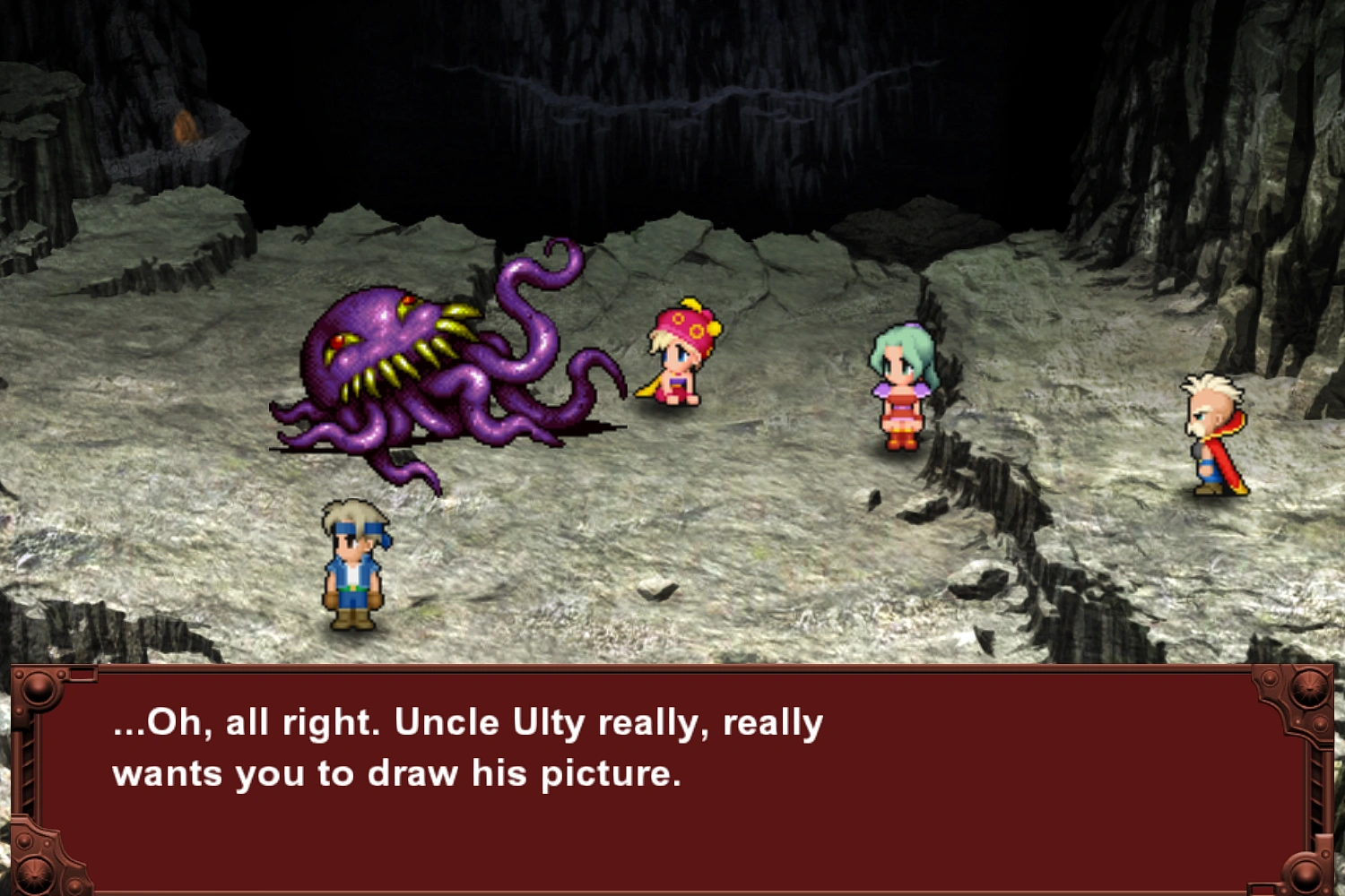 Terra, Locke and Strago went to the Esper Caves to the west, unaware Relm had followed. Relm tailed them through the caves, narrowly avoiding being caught, until the three found a shrine with effigies to the Warring Triad, the gods of magic. Relm listened in as Strago explained the history of the Triad to Terra and Locke, and they were attacked by Ultros. During the battle Relm intervened and prepared to draw Ultros, but he insulted her and refused. Relm feigned like she would leap off a ledge in despair, and Terra and Locke talked Ultros into letting her draw him. Relm used her Sketch ability on Ultros and, horrified to see he was a "washed-up old octopus", he fled. Terra and Locke were convinced of Relm's abilities and agreed to let her accompany them.