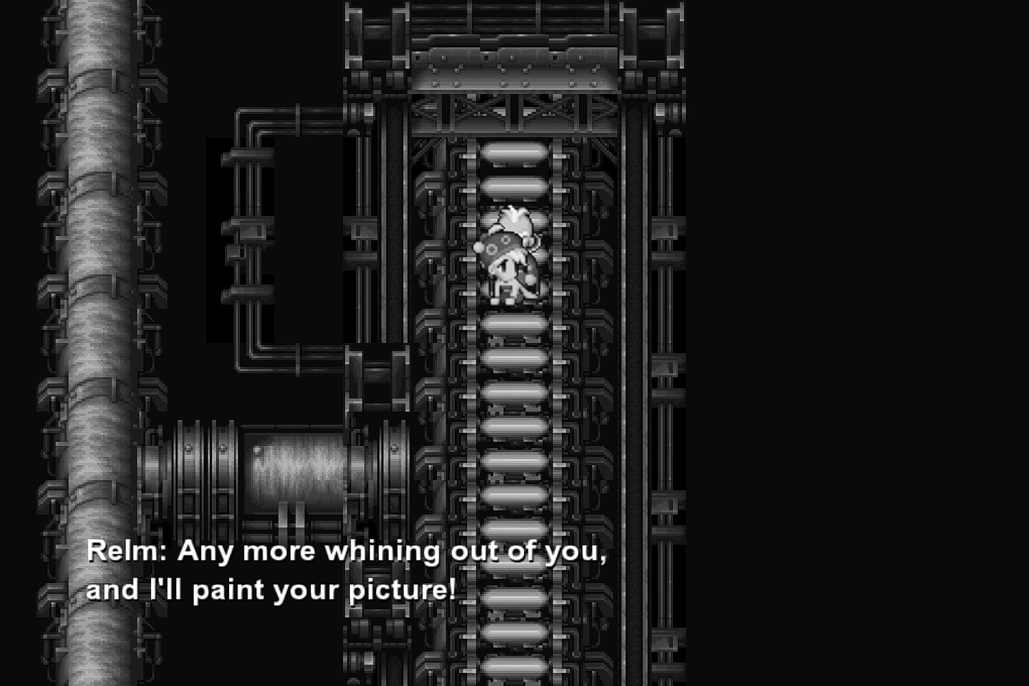 The rest of their allies escaped the Empire on their airship, the Blackjack. They met Locke and Terra's new allies and Sabin laughed at the idea of a kid accompanying them. Relm replied with an insult and a threat to paint his portrait. To the rest of the group's confusion, Terra, Locke and Strago took the threat seriously and acquiesced to let her come. Edgar inquired about her age, seemingly interested in her, but backed off on learning Relm was only ten.