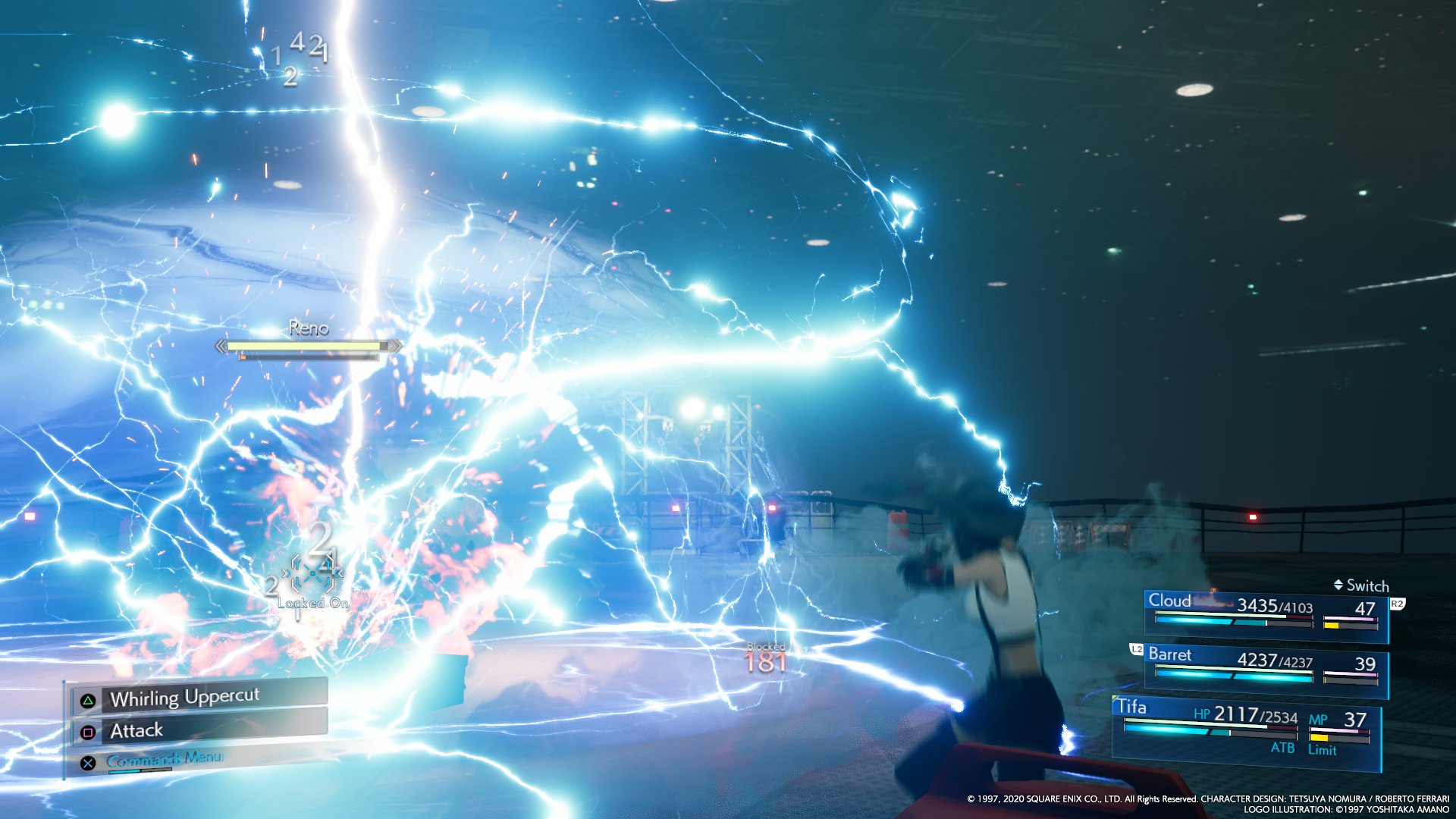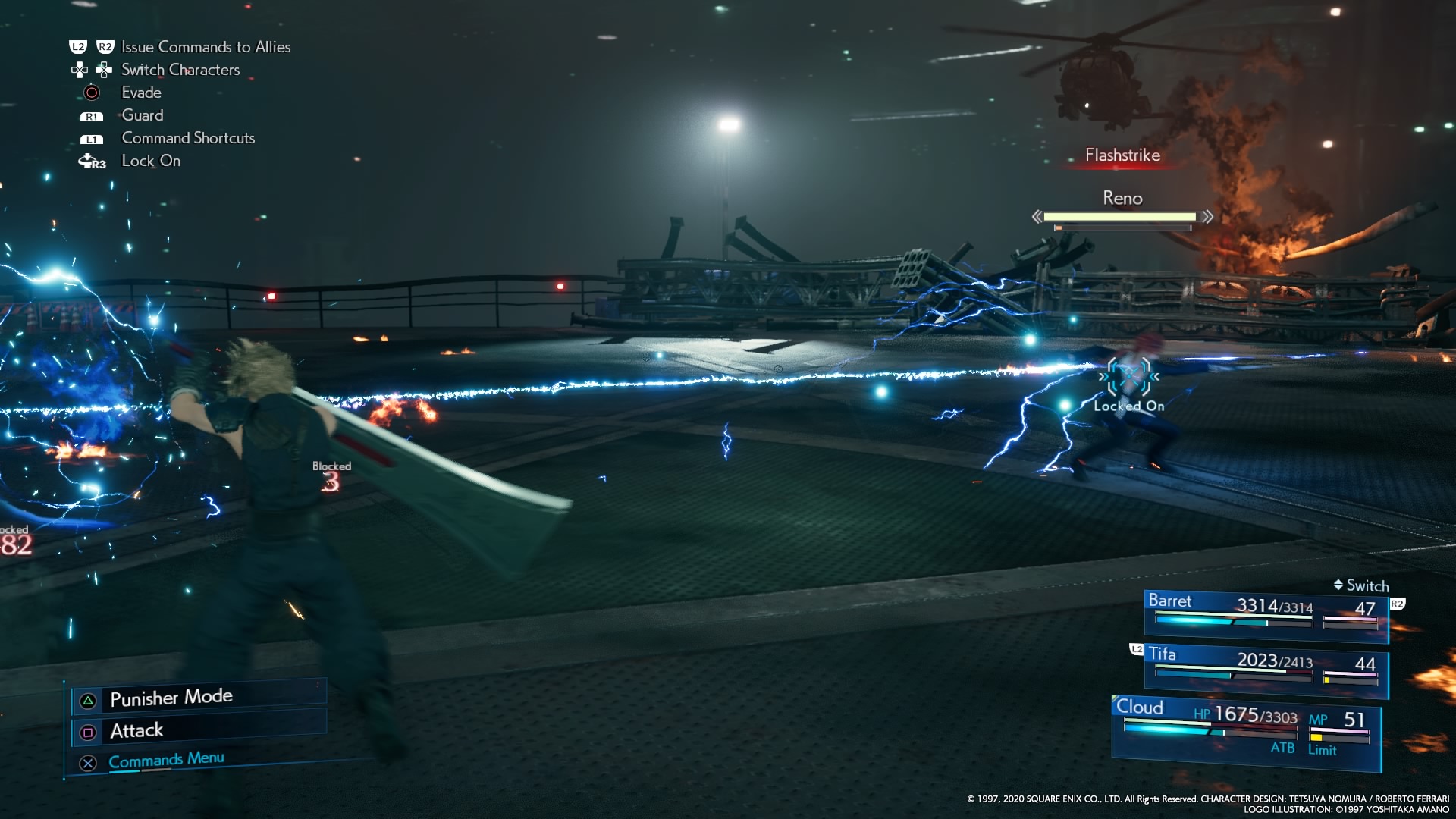 Barret can absorb a lot of damage with Lifesaver, meaning the party will only have to focus on healing him. When Reno remains stationary for a time, this is a good chance for Cloud to use his abilities, Tifa to use her Unbridled Strength, and Barret to use Overcharge. When the bombing run is coming the player should run to avoid it, or guard to reduce as much damage as possible, then heal. When Reno puts up a Pyramid, the player should pressure him to end this. When Rude's helicopter joins, Barret can shoot at it and everyone can cast spells against it, causing it to crash. When both Reno and Rude are present, the player can continue to avoid Reno's attacks, and then use physical abilities to deal most damage.