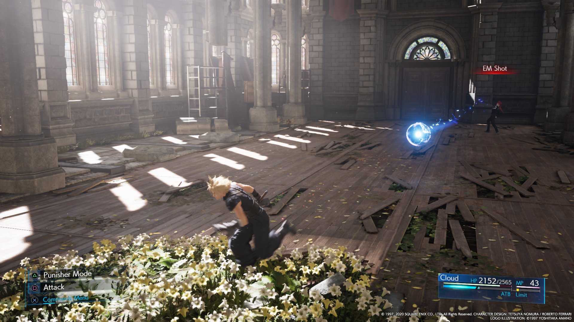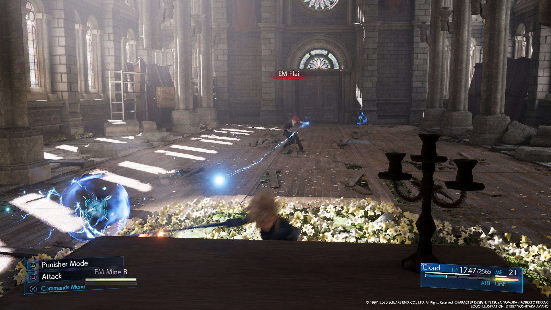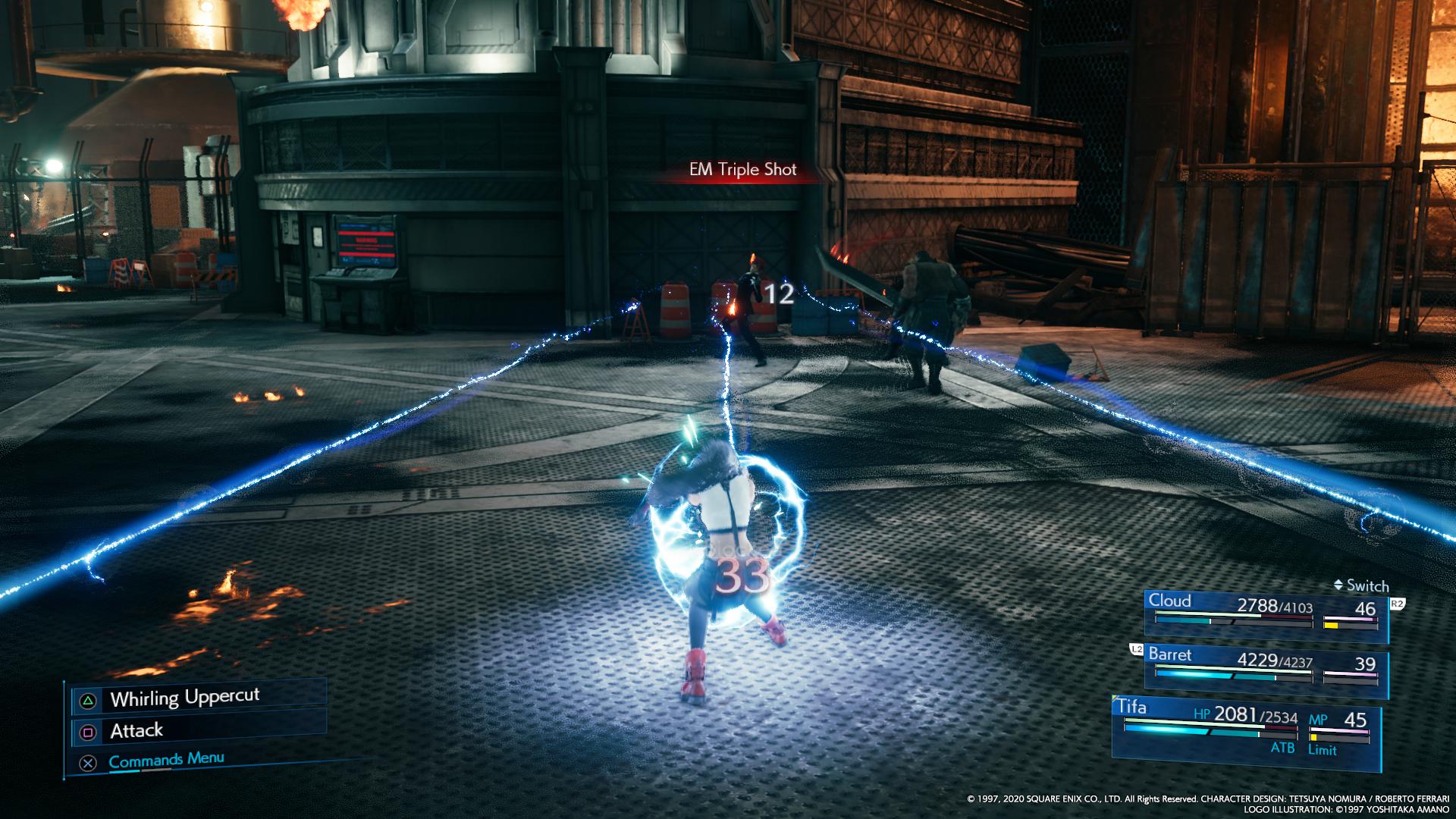 After losing half HP, Reno will jump near the entrance door and toss out electric mines, which will slowly move towards the player, and will be linked, dealing damage on contact. The player needs to avoid being trapped in these or try to destroy them. If Cloud gets too close, takes too long to destroy and mines, or get surrounded by them, Reno will use EM Flail, which will stun Cloud, and the follow-up with Bright Spark to deal massive damage. The mines can be assessed, but have no entry in the enemy intel.
