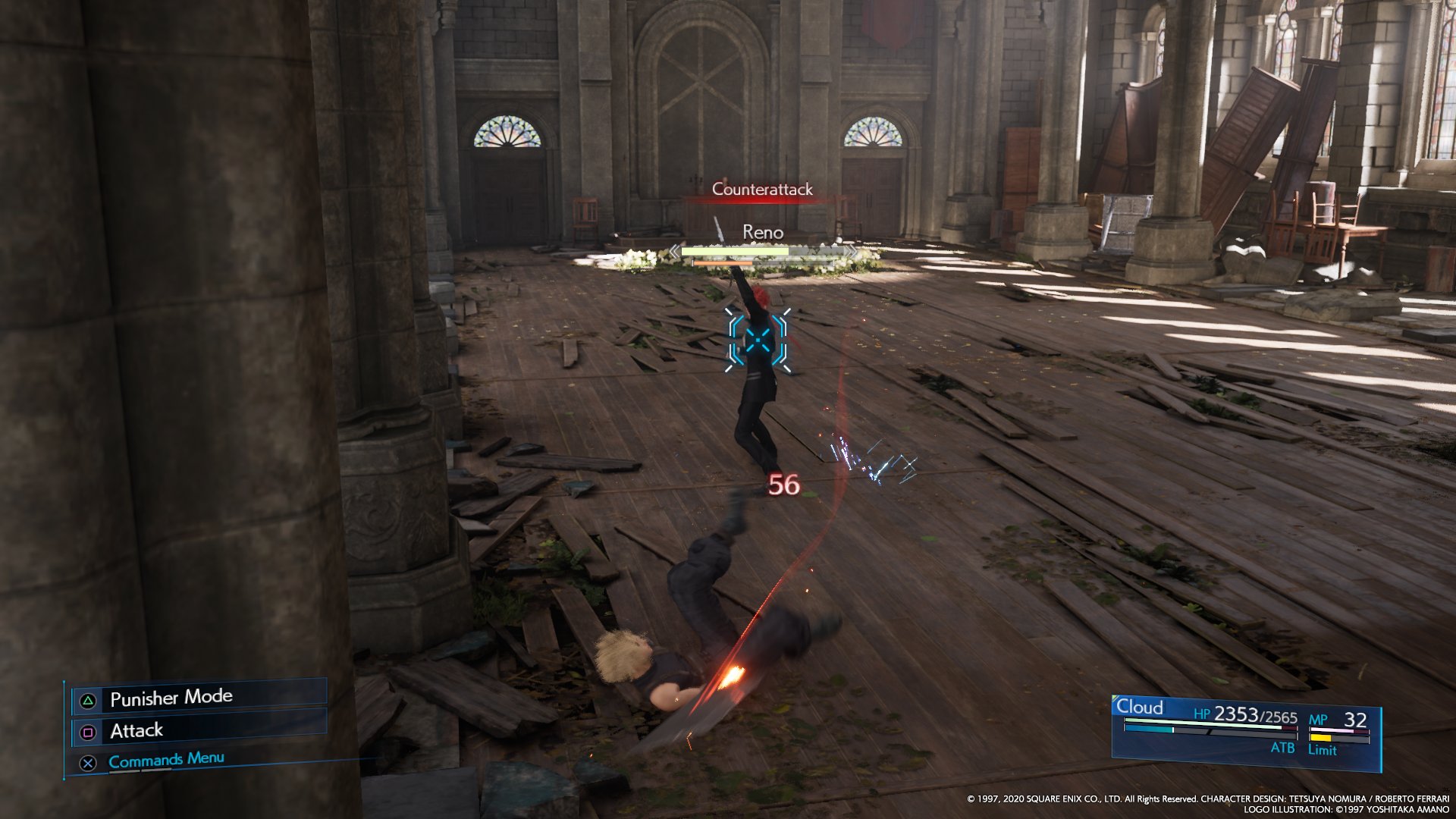 The player can also dodge his counterattack, and then unleash Cloud's abilities against him. The player can wait for Reno to lunge in with an attack, and then dodge, pressuring Reno. At this point, the player can enter Punisher Mode and unleash Cloud's strong attacks and abilities against him. Reno can also be staggered to deal significant damage.