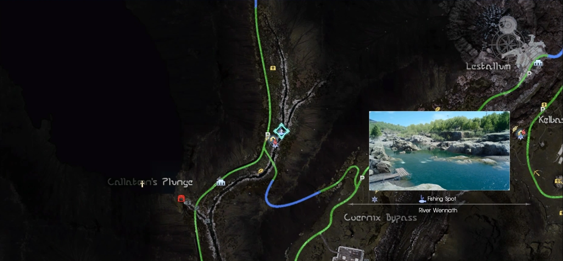 River Wennath is a fishing spot in Final Fantasy XV on the riverside northeast from Burbost Souvenir Emporium, near the River Wennath parking spot. The player can find Navyth Arlund here if they already completed his quest at Neeglyss Pond.