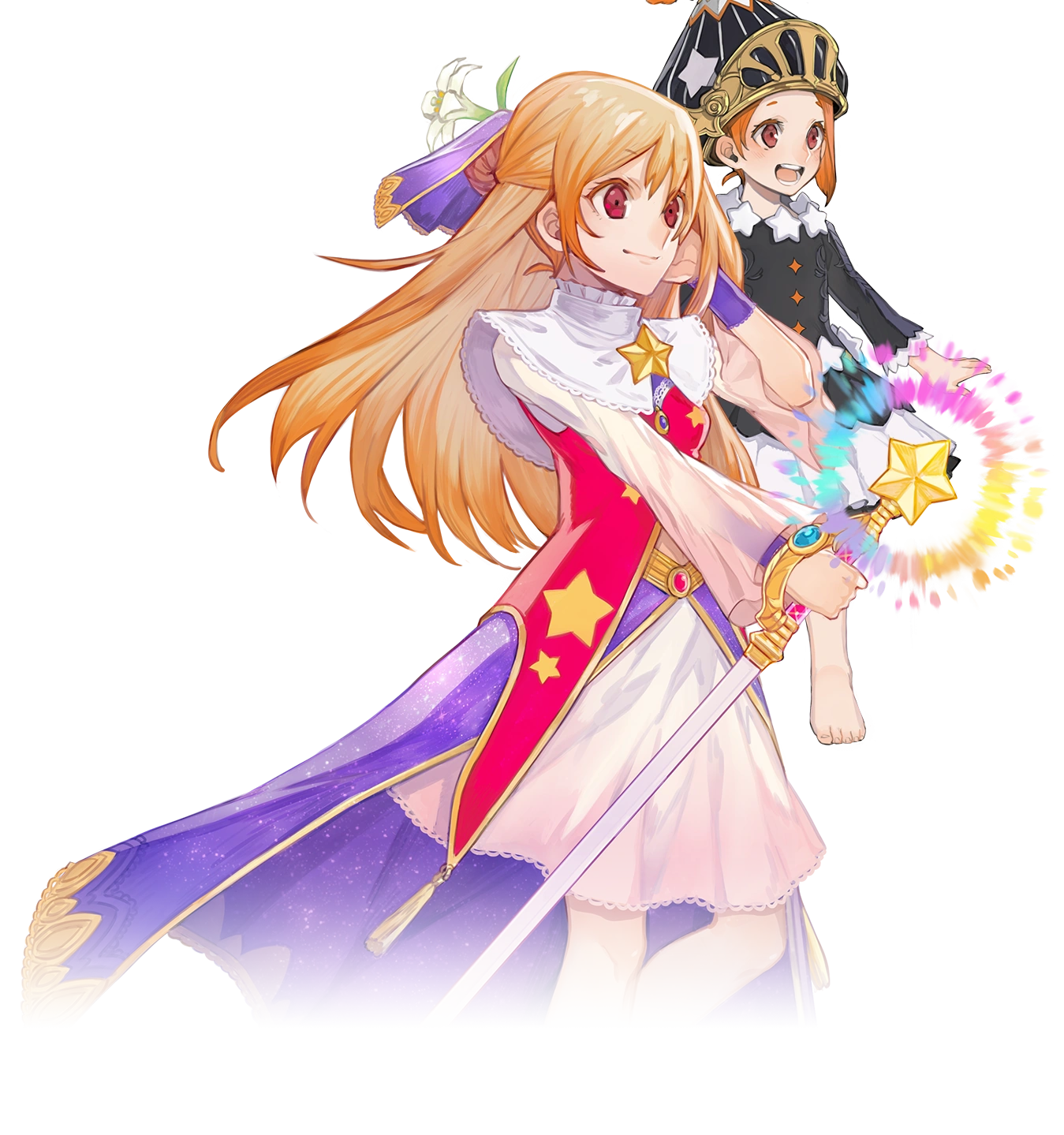 As a grown up, she has blonde hair like Fina and wears the time mage attire of a red, white, and purple dress with star, white collar, red shoes and a star-shaped brooch. She wears a purple veil and a white lily on the back of her head. As shown by her art, her weapon of choice is a dual purpose sword that can be used as a rod while the blade is sheathed, with a golden star at the tip of the handle.