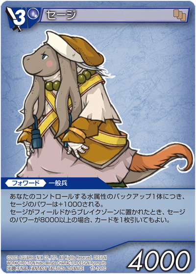 Sage is a job in Final Fantasy Tactics Advance exclusive to nu mou. Sages are similar to Alchemists in that they have some status ailment magic and wield maces. While Sages have the highest stat total of all jobs, they are tied for the slowest job. It is to a nu mou's advantage to learn the Sagacity Skill, especially the powerful spells Ultima Blow and Giga Flare, and consider blending in levels of Morpher to help alleviate the speed weakness of Sages.