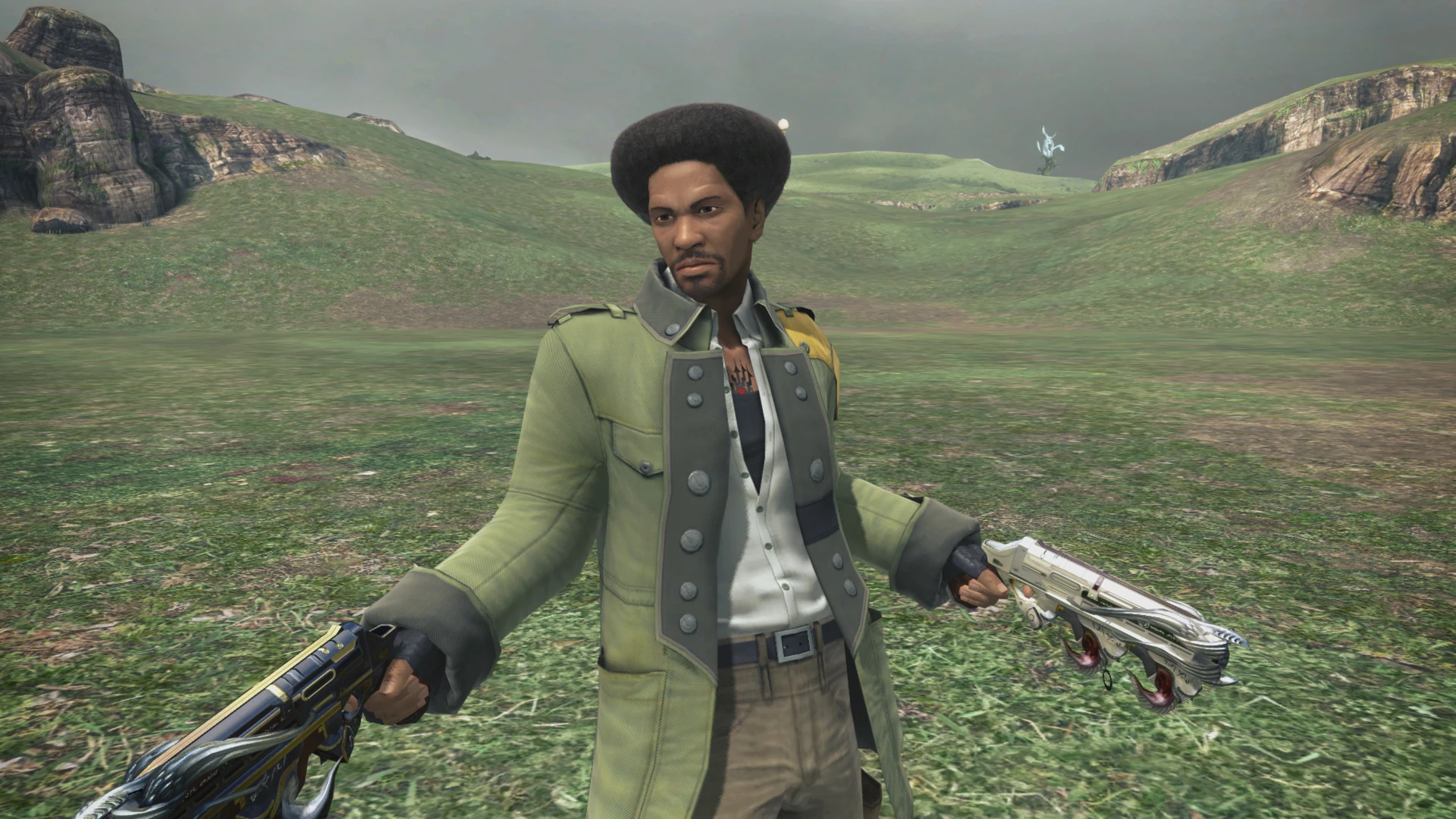 Sazh is a playable character in Final Fantasy XIII who wields dual pistols in battle, thus being a ranged fighter, and can combine them into one for a finishing attack. He has a unique Blitz, and specializes in fire-elemental attacks and offensive buffs. His signature attack is Cold Blood, which has him rain down bullets upon his opponents.