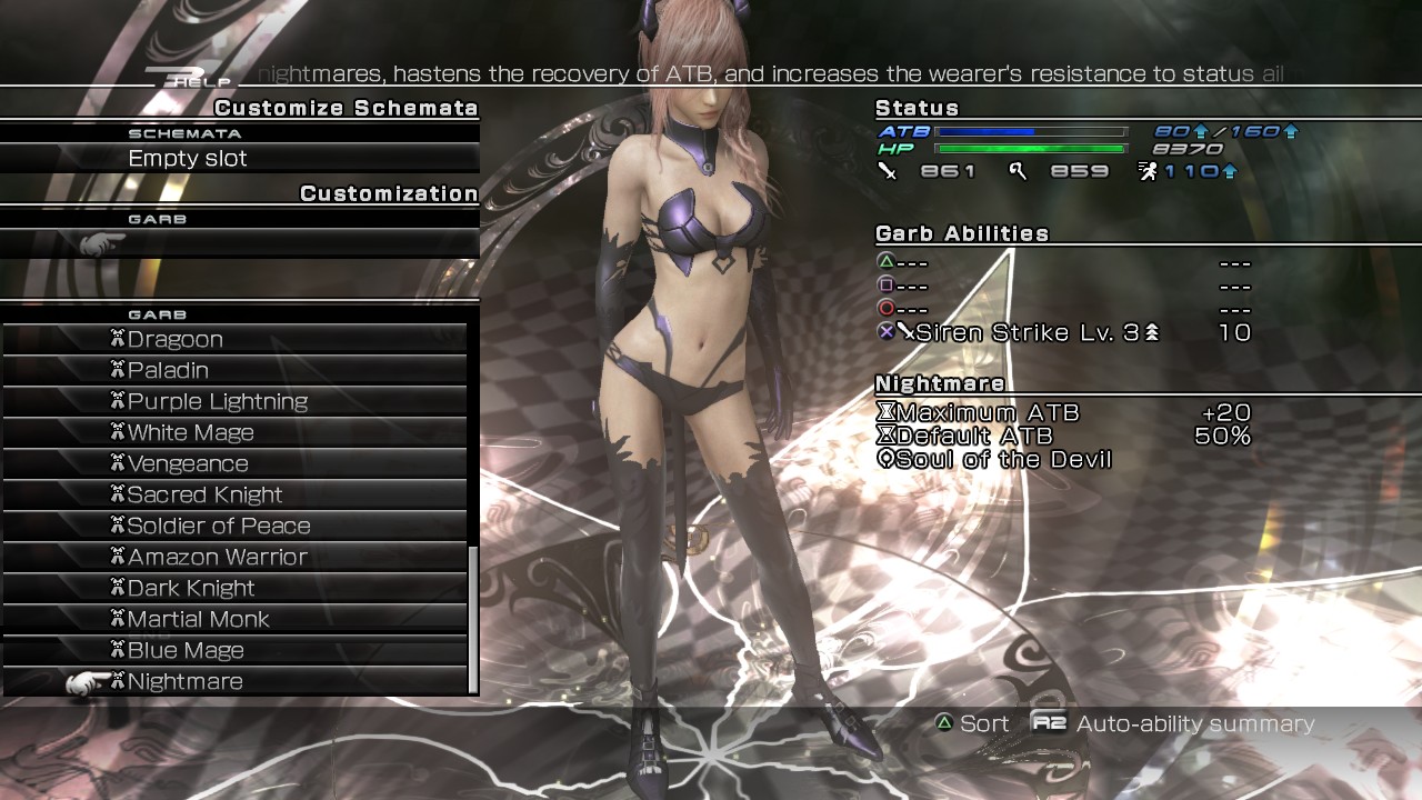 Each schema may have different statistics and special abilities, varying by the assigned equipment pieces and abilities. There are more than eighty different types of outfit and the player can change her look. Players can customize each different part on her outfit, and change colors. If the player has save data available from Final Fantasy XIII and/or Final Fantasy XIII-2 players can obtain Lightning's outfits from those games. Additionally, playing the demo and posting the Battle Score against Zaltys to the Outerworld Services rewarded the player with the Siegfried garb. North American players who own the PlayStation 3 demo get the Utsusemi garb.