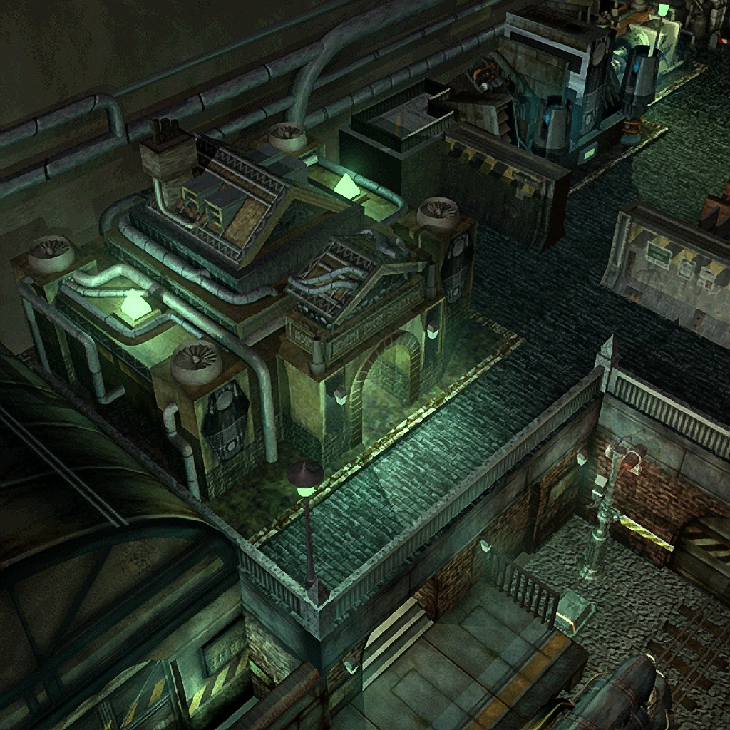 The Sector 1 area is walled-off area reached from the Sector 1 Station. It comprises a few small metal buildings across a stone floor alongside the wall surrounding Sector 1. Within the area are metal pipes, metal framing around the buildings, and dim street lamps. Above some metal framing is a screen, showing the words "INTRUDER", "WARNING", and four Kanji characters. In the center of the area is a narrow building resembling a bunker at its front with a large clock tower at its top.