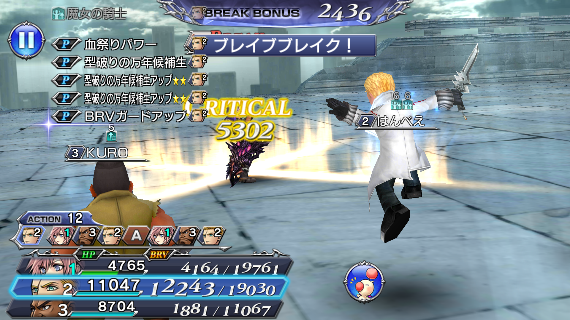 | 5-Hit Group ranged BRV+HP split Attack 4 times. Increases BRV damage to single targets by 60%. Deals Weakness BRV damage to debuffed targets by 50%. Allows for 180% Stolen MAX BRV Overflow. Deals 50% Splash HP Damage to non-targets. Grants Sorceress's Knight for 6 turns. Grants MAX BRV UpMAX BRV Up raises Max BRV. for 6 turns. 60% chance to inflict MAX BRV DownMAX BRV Down lowers MAX BRV. on All Enemies for 6 turns. | ||||