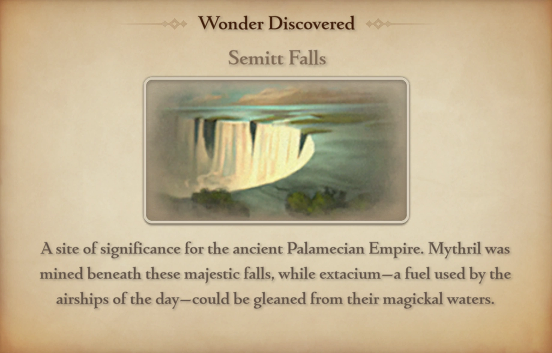 A site of significance for the ancient Palamecian Empire. Mythril was mined beneath these majestic falls, while extacium—a fuel used by the airships of the day—could be gleaned from their magickal waters.