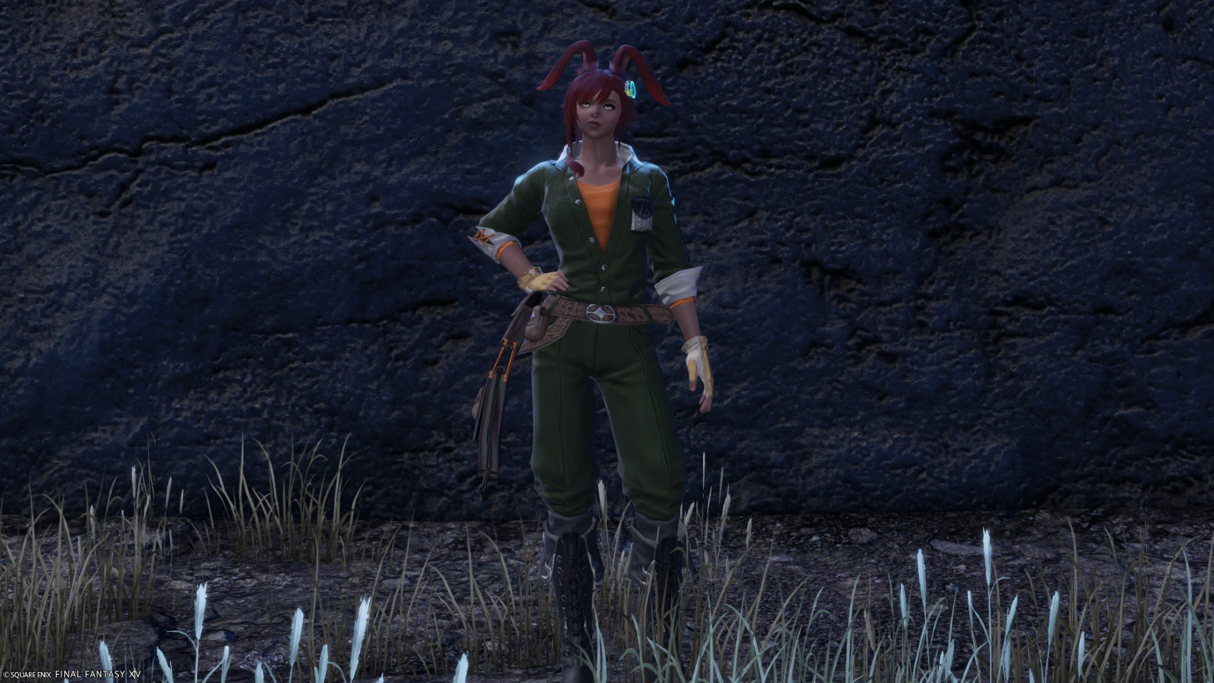 Shaloaci is a dark skinned shetona with red hair and pale-yellow eyes, she wears a marsh green craftsmen's coverall top with an orange shirt underneath, field fiends halfgloves dyed a cork brown, marsh green snow cotton breeches and jet black swallowskin boots.