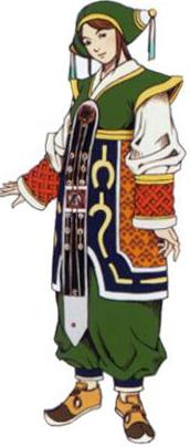Shelinda has brown hair with green hat adorned with white cones at each side with gold spheres and white-and-light blue strings. She wears a white blouse with yellow-and-red cuffs, and a green outfit with dark blue-and-orange belt-like material around her waist; the dark blue part is adorned with yellow ornaments. A white-and-black strip with varied designs overhangs from her breasts and she wears brown shoes.
