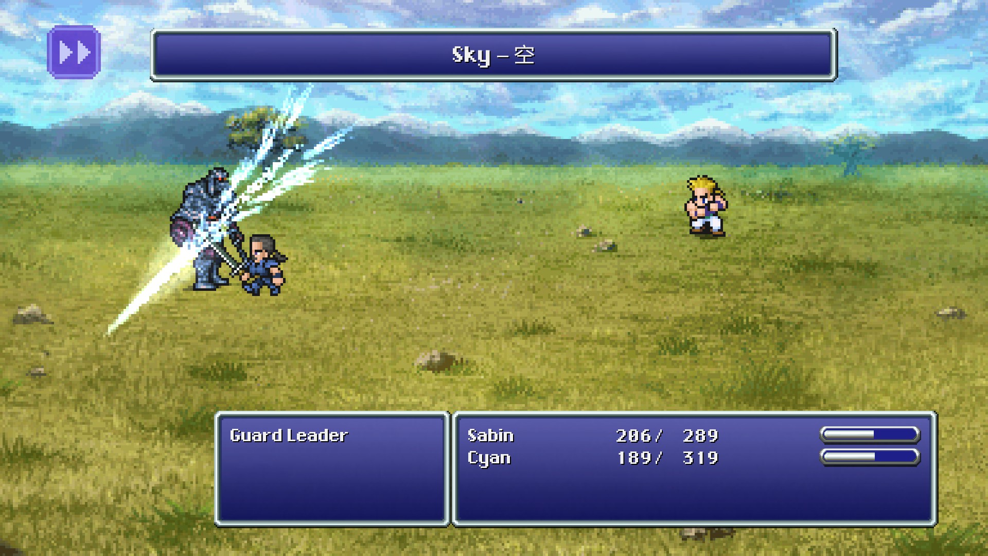 Sky can deal heavy unblockable damage to a single target, normally over twice that of the basic Bushido technique, Fang (stats depending). Because Sky is a counterattack and takes two charges, it cannot be specifically targeted, and is less effective the more party members are available. Sky can be used effectively with Knight's Code, as Cyan will cover for a critical party member and then unleash the attack.