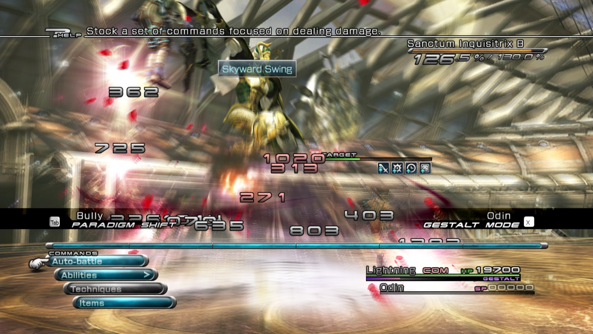 Skyward Swing (天臨, Tenrin?, lit. Heaven's Wheel) is a recurring ability in the Final Fantasy series. It is an ability used exclusively by Lightning and her Eidolon, Odin.