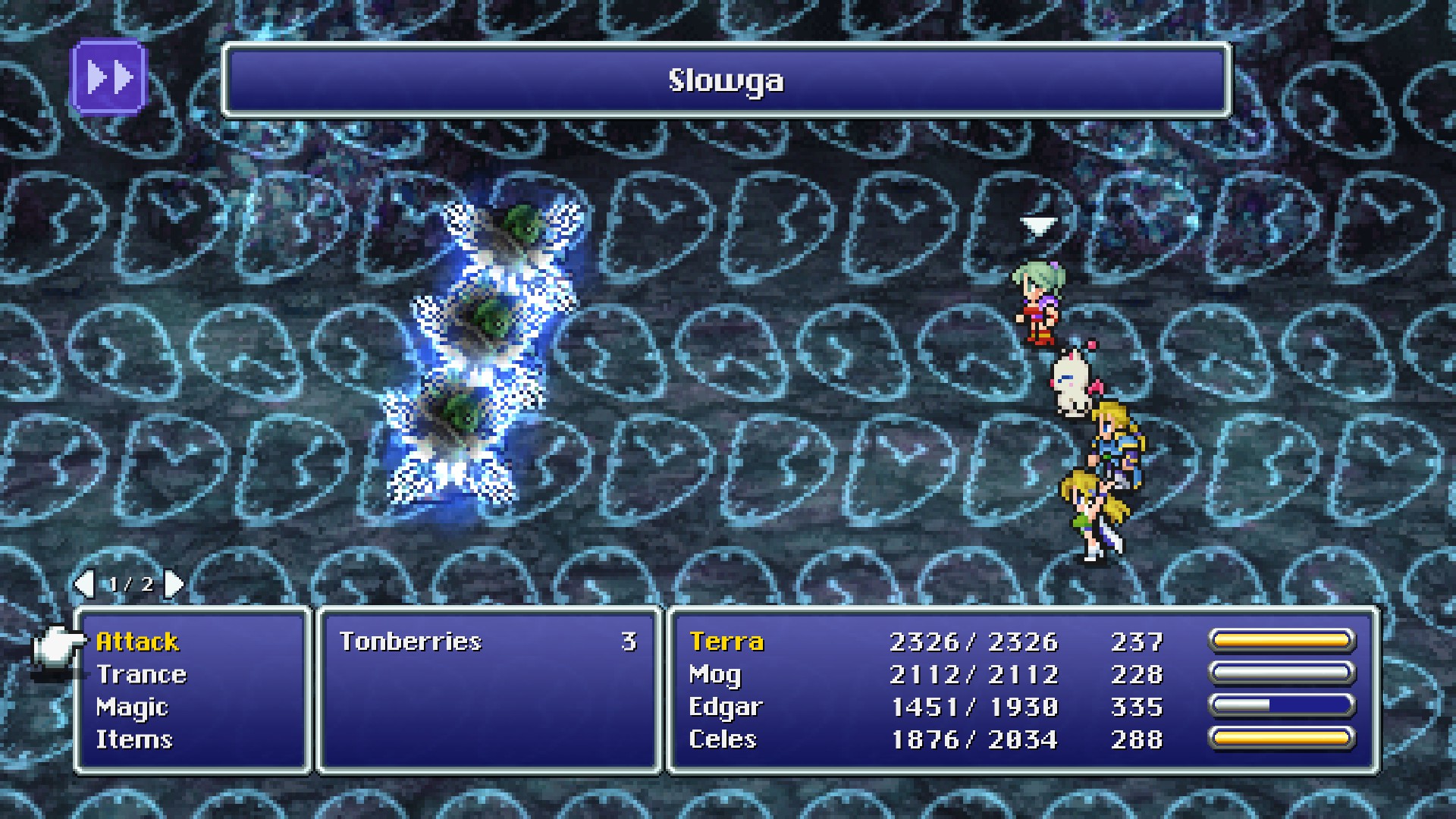 Slowga, also known as Slow 2,[1][2] is an Effect spell in Final Fantasy VI. It inflicts the slow effect on all enemies , which halves the rate their Active Time Battle bar fills, effectively halving their turn rates. The spell is taught by magicite, and outclasses the basic Slow spell that only targets one unit.