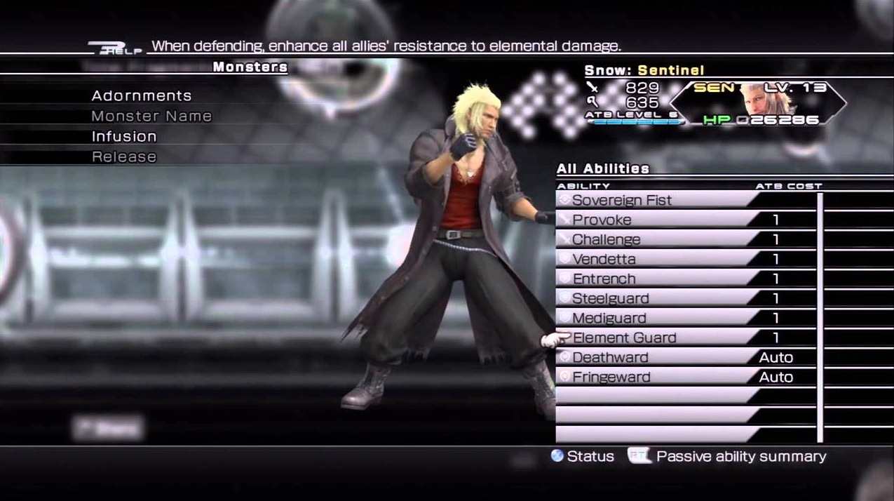 By foregoing excess HP development to boost to his Strength growth, Snow can become the best offensive Sentinels, using counterattacks in random encounters, and Guard and Ward abilities against bosses. His Feral Link is Sovereign Fist, a strong, physical attack that hits Snow's target and any surrounding enemies twice, useful for disrupting coordinated group assaults.