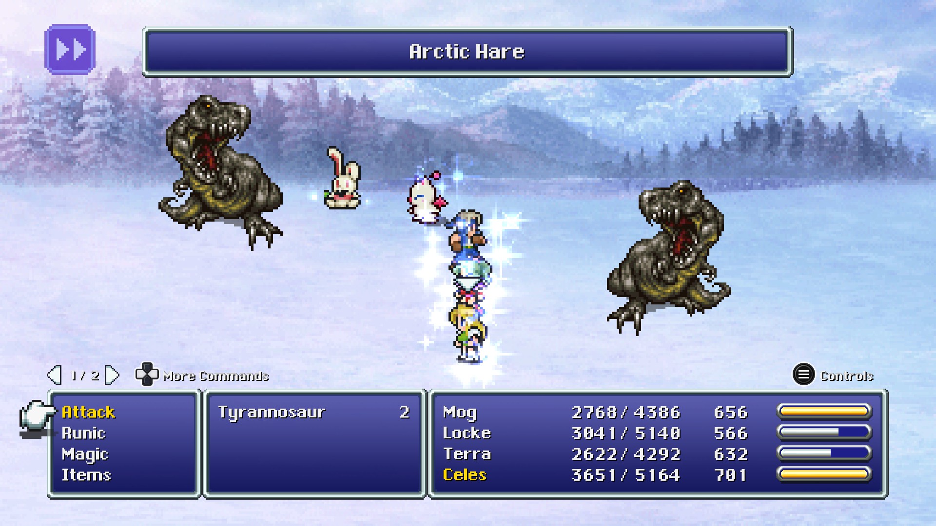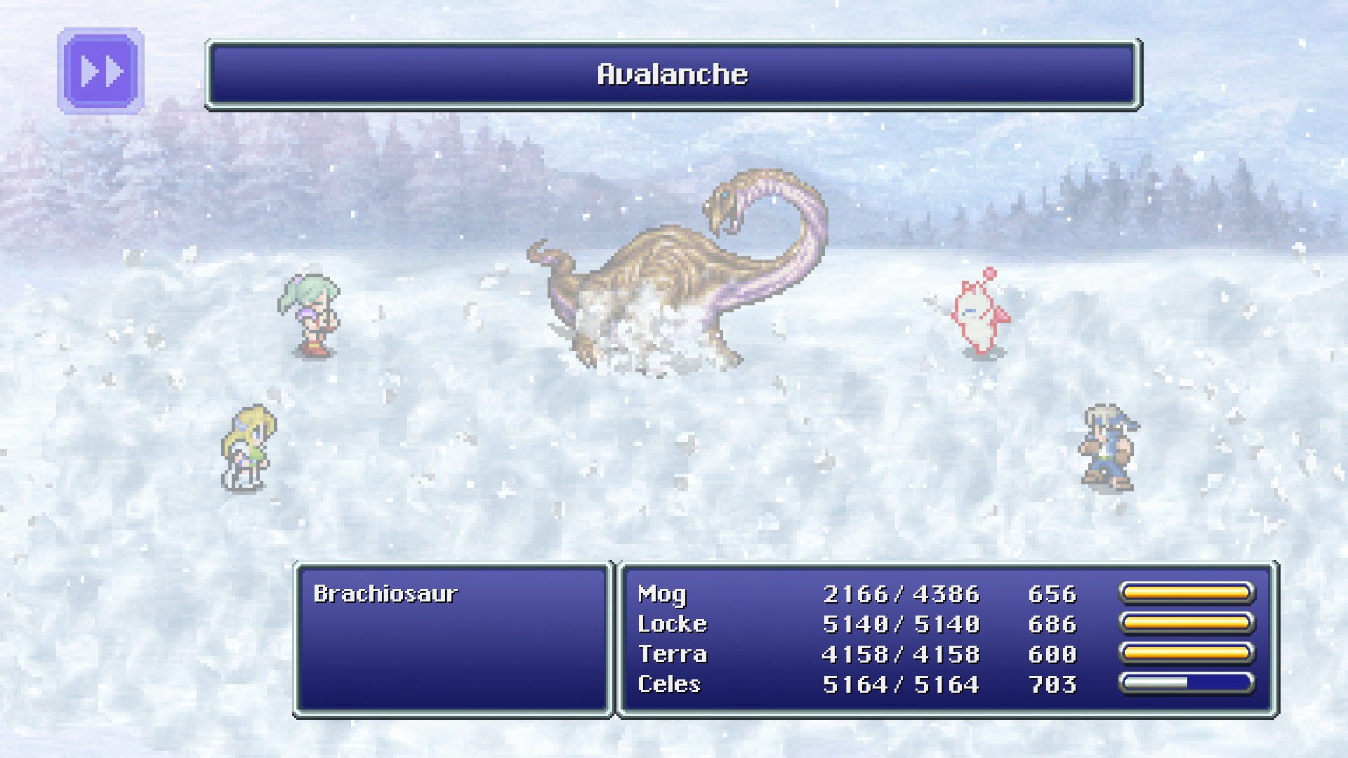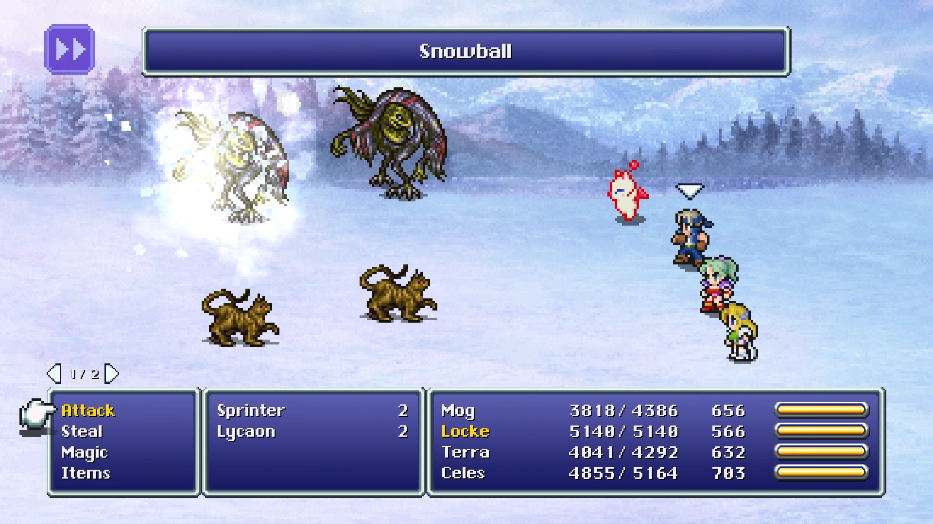 Snowman Rondo, also known as Snowman Jazz,[1][2] is a Dance option for Mog in Final Fantasy VI. It grants the abilities Snowball, Avalanche, Snare, and Arctic Hare. These abilities have a variety of effects, between a chance to deal ice-elemental damage to all enemies, or to heal all allies' HP. It is learned from battling in snowy locations.