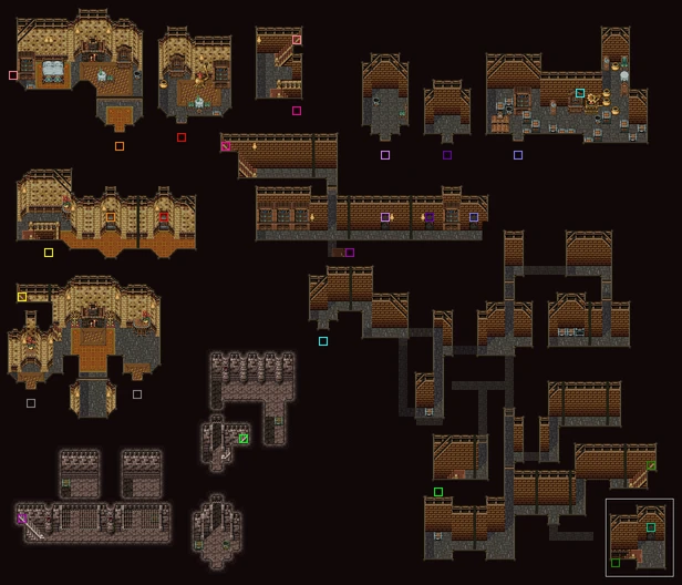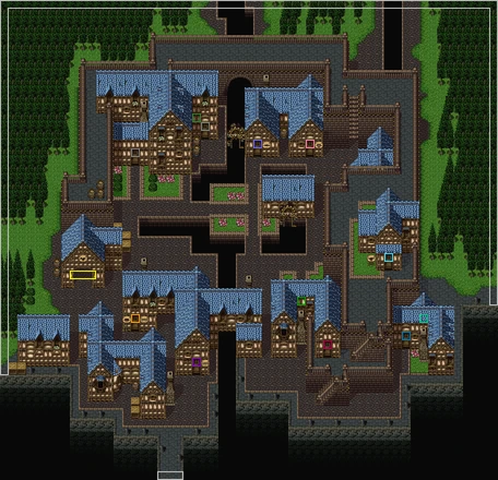 In the south-west part of town, the relic shop, inn, and pub occupy a single large building, with the inn in a raised area connecting the other two shops. Outside, a walkway runs beneath the inn. South of the entrance to the pub is the entrance to the docks, and west of the relic ship is a chocobo stable on the entrance of town. The north-east part of town is taken up by the weapon, armor, and item shops.