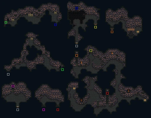 The cave opens from Figaro Castle to a recovery spring with a turtle living there, and this room exists into a large central cavern. A smaller upper part of the cave is to the left, and to the right the cave winds down and up to another elevated area of the cave, which descends down to the exit to South Figaro.