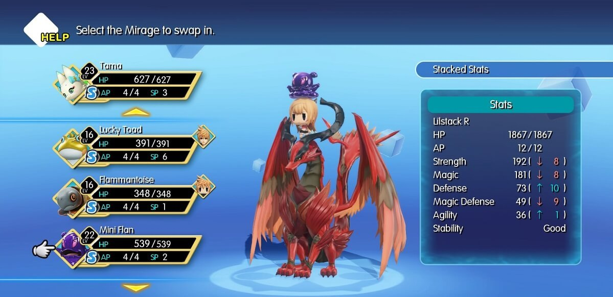 Characters in a stack have combined stats with one another (such as HP, Strength, and Defense) and the stack also inherits any elemental and ailment resistances and weaknesses, and any non-unique abilities from the characters within it.