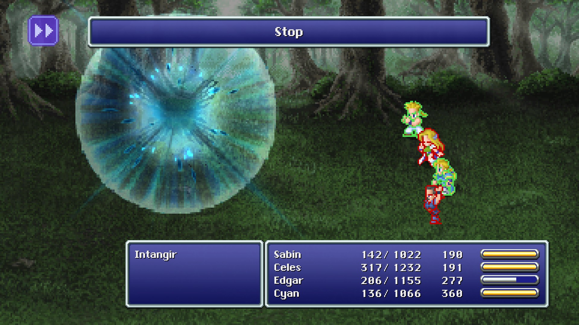 Because Stop is unaffected by the caster's stats, it can be taught to and used by any party member. In fact, it may be better for non-spellcaster party members to use Stop while allowing spellcasters to preserve their MP for offensive or healing spells where their MP is more important.