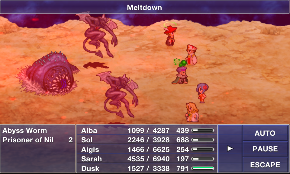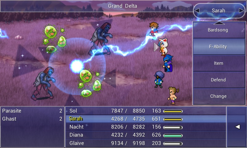 The Summoner occupies a unique spot in Final Fantasy Dimensions in terms of its progression. Unlike the White and Black Mage, whose spells must be bought as the story progresses, the Summoner instead gains Eidolons by defeating them in boss battles in optional dungeons towards the end of each chapter. Additionally, the Eidolons are split between both groups and remain separate until the parties eventually merge in the late-game. In the early-game, it is thus useful to equip the Summoner with additional abilities and Fusion Abilities to broaden their offensive abilities. Although magically focused, a Summoner lags behind the Black Mage in Intelligence and a White Mage in Mind, though are still more potent in both stats than a Red Mage. They suffer from poor physical stats, including speed, but have more freedom in their equipment choices. Rods, staves, and whips allow them more optimization; Mind for Unicorn healing, Intelligence for damage, or whips for a speed boost. As they level up, Summoner helps provide access to a number of Fusion Abilities, such as Grand Delta and Deep Freeze. A number of their Fusion Abilities are useful for leveling Red Mage, who otherwise lack spells with power comparable to Firaga, Thundaga, and Blizzaga.