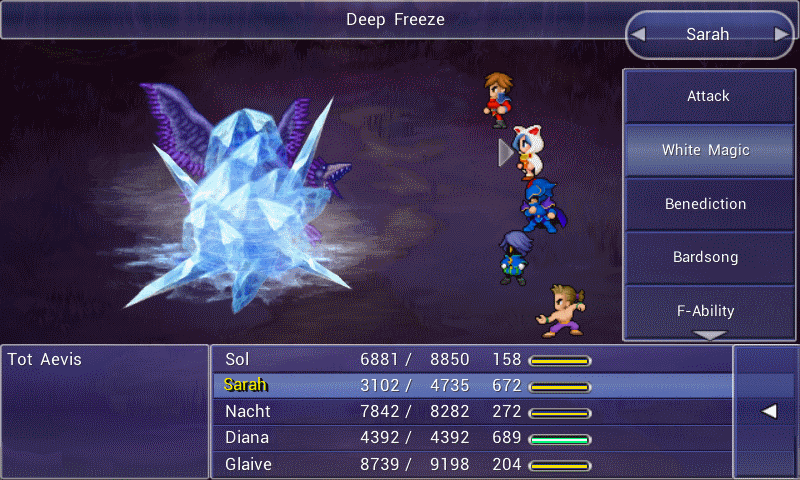 | Deals ice damage to a single target and causes time to stop, preventing action. | |||||