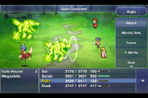 | Gale Crescent | Sylph + Kick | Both | 7 | Physical attack, about 40% more powerful than Kick. Ranged (full damage regardless of row). | |