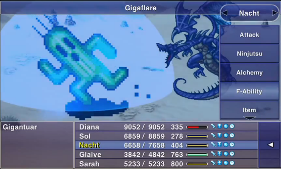 | Gigaflare | Flare + Megaflare | Warriors of Darkness | 99 | Magic-based, cannot be reflected, breaks damage limit.*Despite what the in-game description states, it actually hits all targets. 20~25% more powerful than Ultima. | |