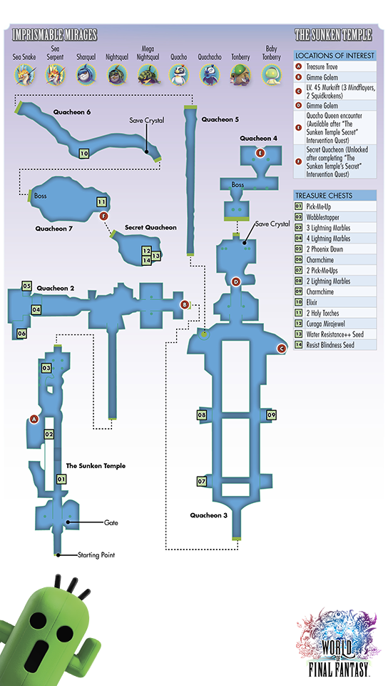 The Sunken Temple is a dungeon located in the Besaid Region of Grymoire in World of Final Fantasy. It is first visited in Chapter 18, "The Fell Spell and the Quacho Queen".