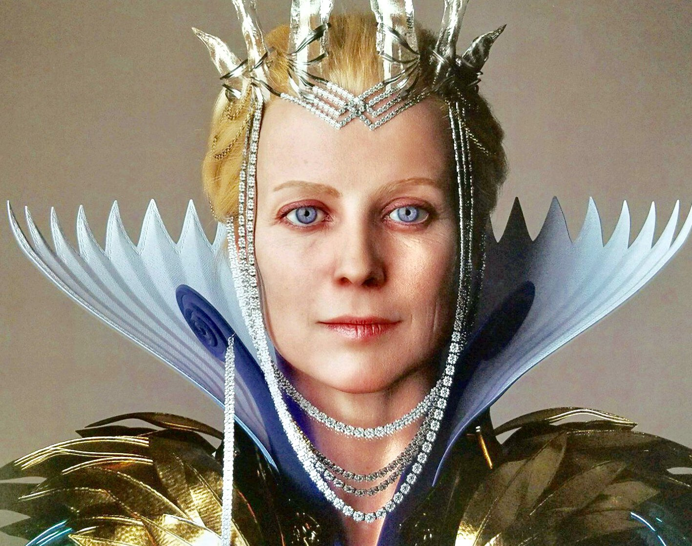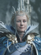 Sylva had blonde hair and blue eyes. She wore a clear crystal crown with tall spikes and a crystal chain, and an elaborate gold and blue dress. Her regalia resembled sylleblossoms, blue flowers associated with Tenebrae and its royal family.