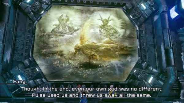 The two search the ruins and come across murals that depict the story of Bhunivelze and the three deities he had created, Pulse, Lindzei and Etro, as well as the birth of mankind and the nature of souls and Chaos. After viewing all three murals the pair opens the door to the chamber where they find the holy clavis, which Fang attempts to destroy. A confused Lightning stops her, and a regimen of Secutors, the military branch of the Order of Salvation, storms the chamber and sets a monster on the pair. While Fang and Lightning battle the beast the Secutors make away with the holy clavis and take it to the Luxerion Cathedral.