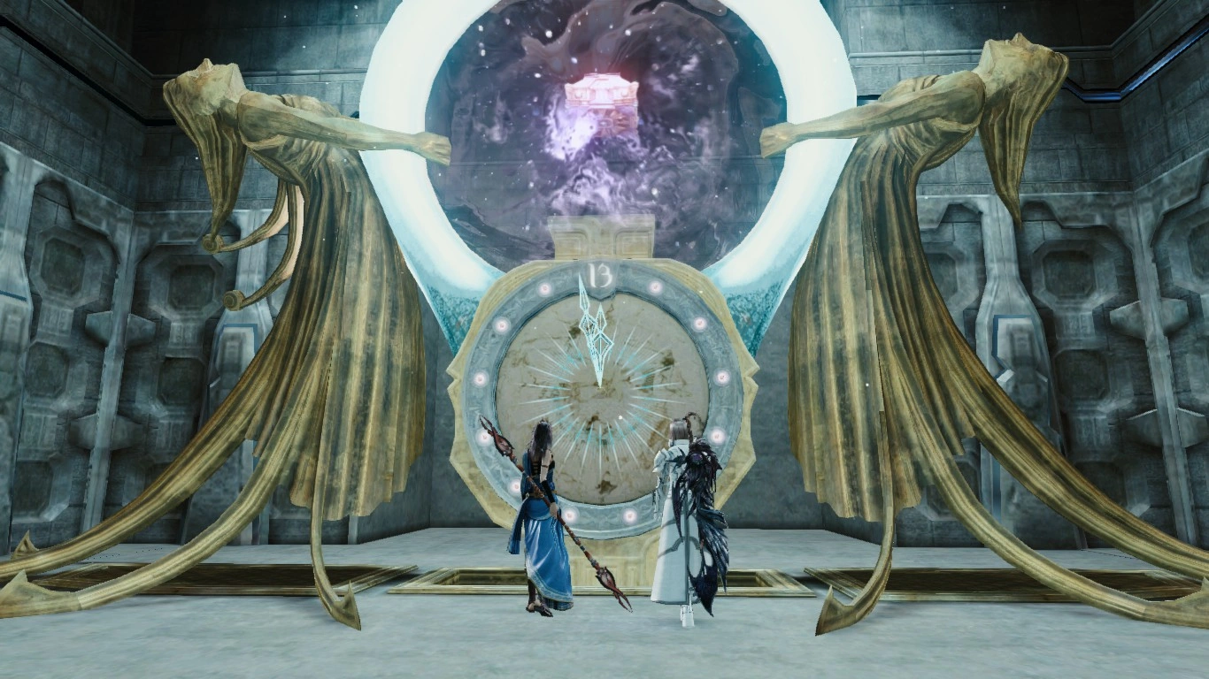After descending into the pit Lightning and Fang emerge at Chamber of Dusk — Lower Level. This area has time doors that open and close at certain times of the day. The doors don't take too long to open, but it wastes time to get trapped behind closed doors. Chronostasis allows one to manipulate the doors; otherwise the player has to hope to get lucky. Checking the stone monuments near time doors to registers them on the map.