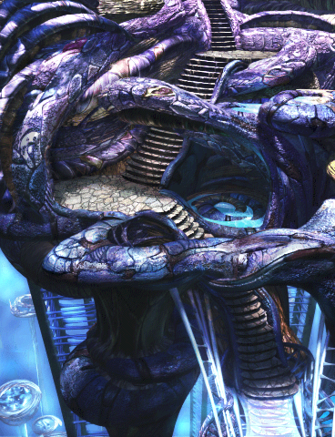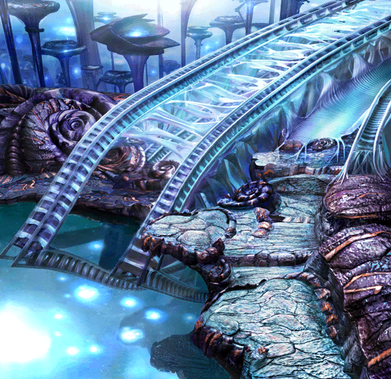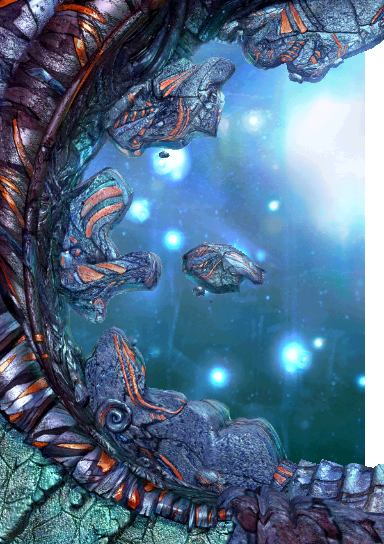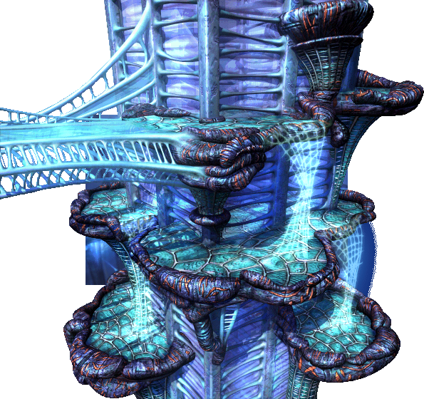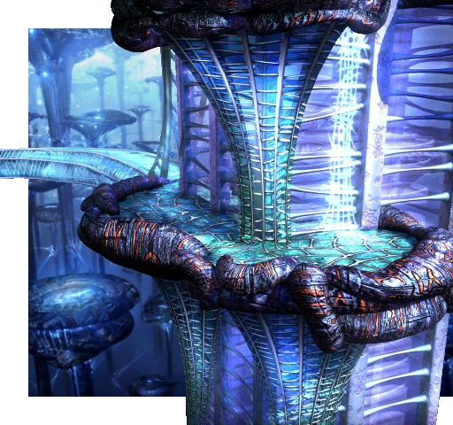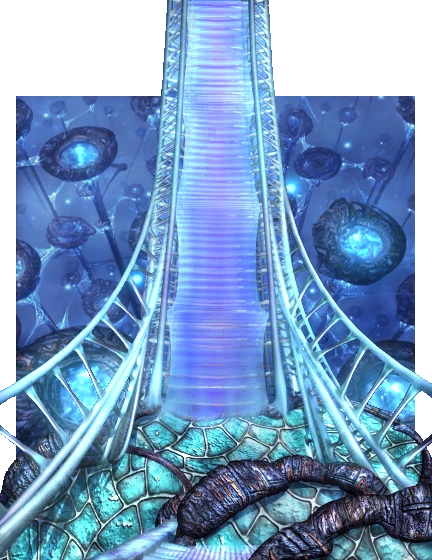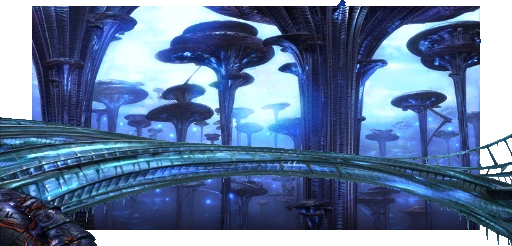 Terra's landscape consists of alien structures attesting to an un-nature beyond Gaian or real-world comprehension. Crystalline structures like coral or dragon-blood trees extend to infinite depths, and frozen analogues to flora punctuate a decaying, porous landscape that can neither be determined architectural, natural, or bioengineered. Unlike Gaia, Terra has no soil nor green vegetation as can be understood, and no overworld to convey that it isn't homogenized. The seemingly deliberate and technological blend with the spontaneous and natural, and neither betray their origin.